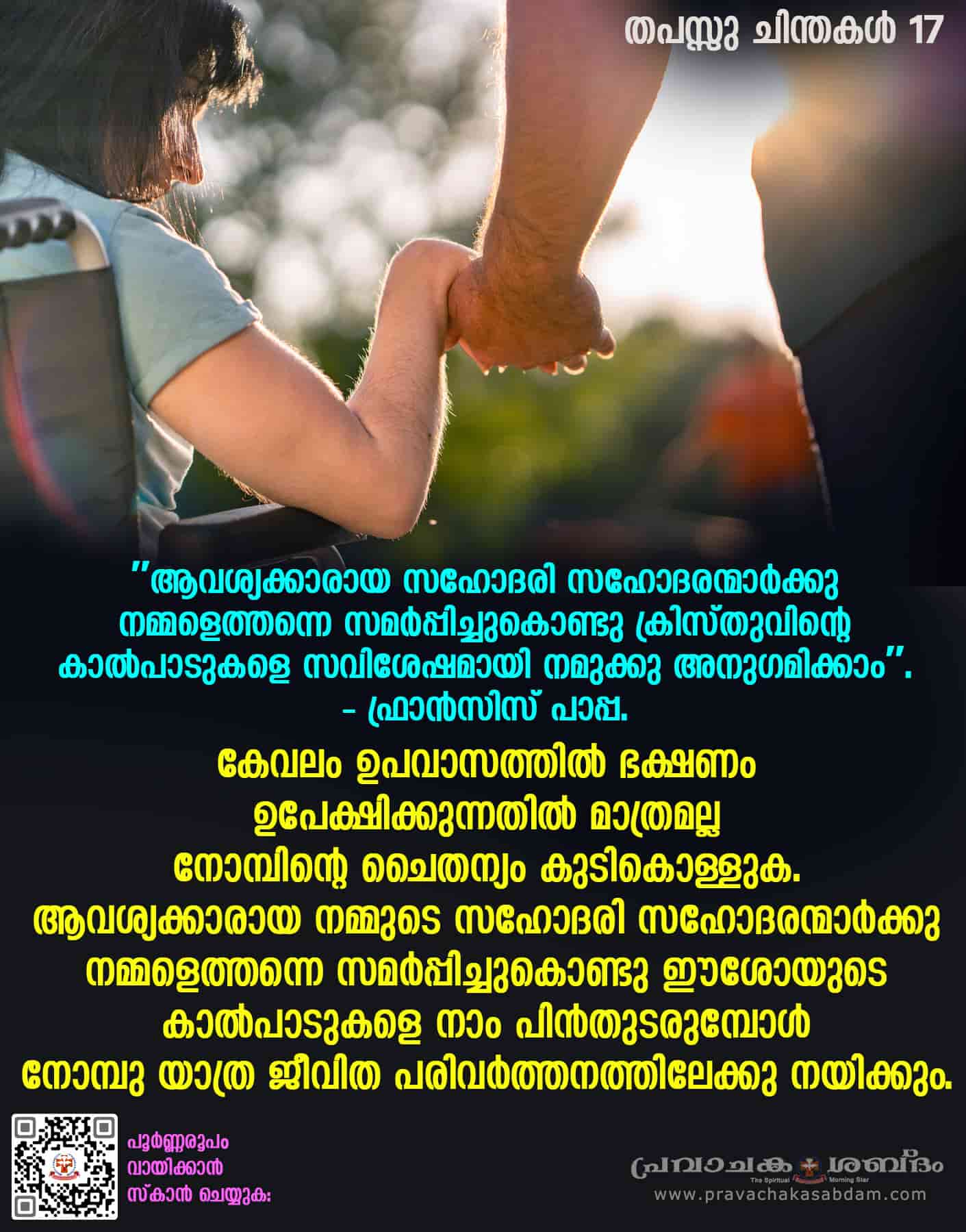 കേവലം ഉപവാസത്തില് ഭക്ഷണം ഉപേക്ഷിക്കുന്നതില് മാത്രമല്ല നോമ്പിന്റെ ചൈതന്യം കുടികൊള്ളുക. ആവശ്യക്കാരായ നമ്മുടെ സഹോദരി സഹോദരന്മാര്ക്കു നമ്മളെത്തന്നെ സമര്പ്പിച്ചു കൊണ്ടു ഈശോയുടെ കാല്പാടുകളെ നാം പിന്തുടരുമ്പോള് നോമ്പു യാത്ര ജീവിത പരിവര്ത്തനത്തിലേക്കു നയിക്കും.