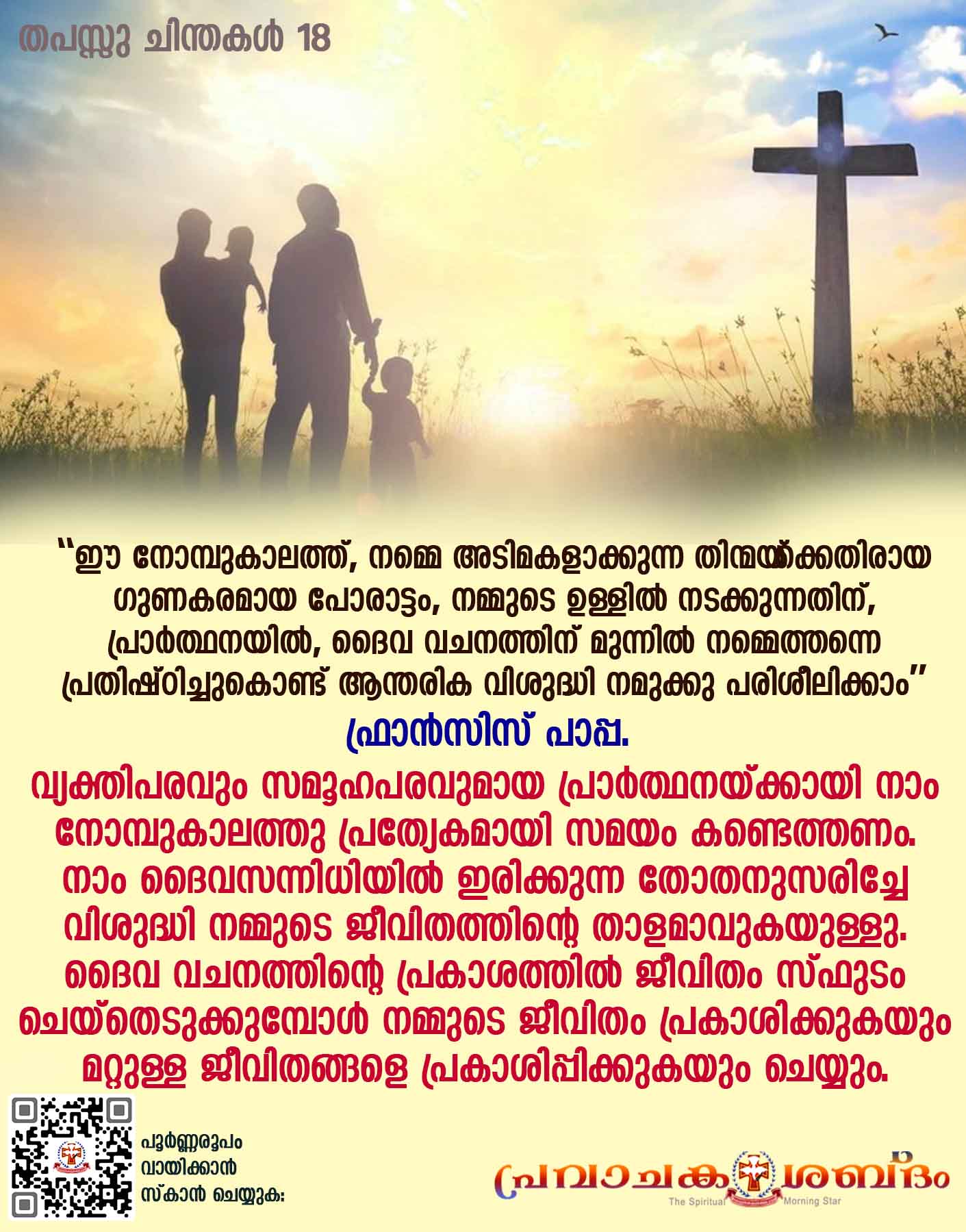 "ഈ നോമ്പുകാലത്ത്, നമ്മെ അടിമകളാക്കുന്ന തിന്മയ്ക്കെതിരായ ഗുണകരമായ പോരാട്ടം, നമ്മുടെ ഉള്ളിൽ നടക്കുന്നതിന്, പ്രാർത്ഥനയിൽ, ദൈവ വചനത്തിന് മുന്നിൽ നമ്മെത്തന്നെ പ്രതിഷ്ഠിച്ചുകൊണ്ട് ആന്തരിക വിശുദ്ധി നമുക്കു പരിശീലിക്കാം" - ഫ്രാൻസിസ് പാപ്പ.