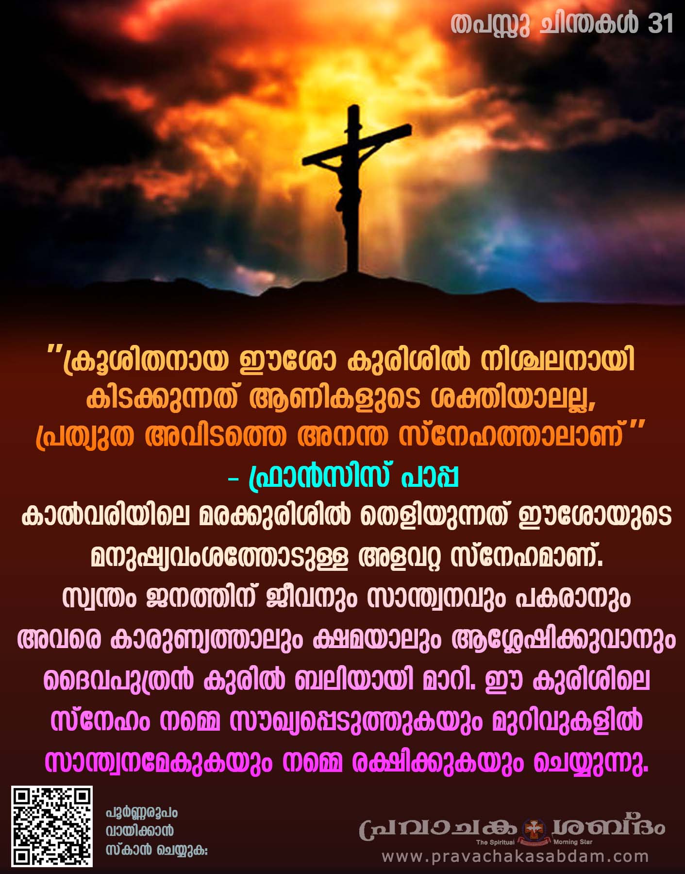 ലോകം ചെയ്ത തിന്മയോട് ദൈവം പ്രതികരിച്ച രീതിയാണ് കുരിശെങ്കിൽ ഇന്നു നമുക്കു ചുറ്റും കാണുന്ന തിന്മകളോട്, നാം പ്രതികരിക്കേണ്ടത് ക്രിസ്തുവിന്റെ കുരിശിലൂടെയായിരിക്കണം. ക്രിസ്തുവിൻ്റെ കുരിശ് സ്നേഹത്തിന്റെയും കാരുണ്യത്തിന്റെയും ക്ഷമയുടെയും പ്രതീകമായതുപോലെ ഈ നോമ്പുകാലത്ത് കുരിശിൻ്റെ സ്നേഹത്തിൻ്റെ ശിഷ്യരായി നമ്മെ വലയം ചെയ്യുന്ന തിന്മകളുടെ ശക്തികളെ കുരിശിനാൽ നമുക്കു നേരിടാം. ക്രിസ്തു ചെയ്തതുപോലെ കുരിശുകള് സ്വയം ഏറ്റെടുത്തുകൊണ്ട് തിന്മയെ നന്മകൊണ്ട് കീഴടക്കാം.
