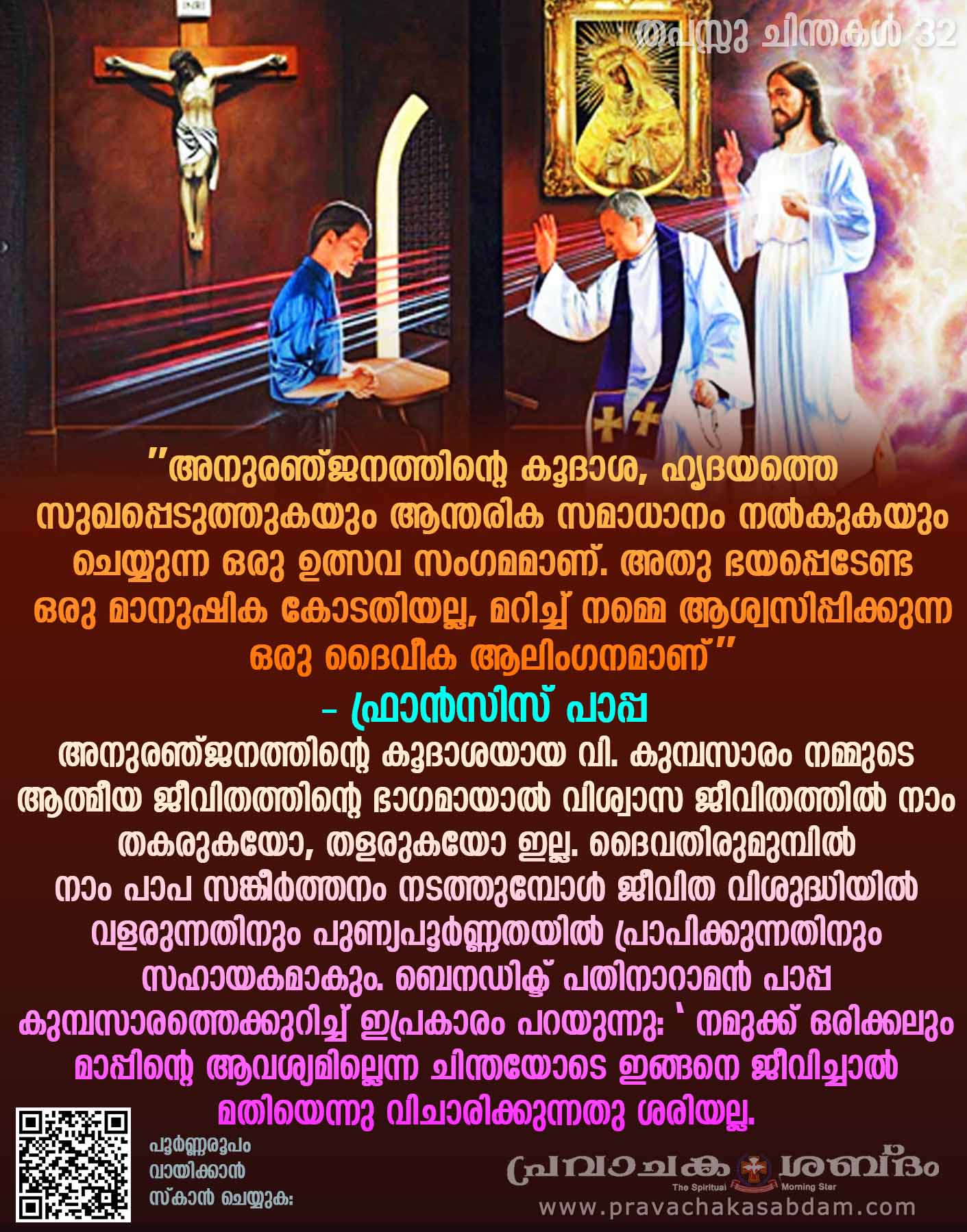 "അനുരഞ്ജനത്തിന്റെ കൂദാശ, ഹൃദയത്തെ സുഖപ്പെടുത്തുകയും ആന്തരിക സമാധാനം നൽകുകയും ചെയ്യുന്ന ഒരു ഉത്സവ സംഗമമാണ്. അതു ഭയപ്പെടേണ്ട ഒരു മാനുഷിക കോടതിയല്ല, മറിച്ച് നമ്മെ ആശ്വസിപ്പിക്കുന്ന ഒരു ദൈവീക ആലിംഗനമാണ്" - ഫ്രാൻസിസ് പാപ്പ.