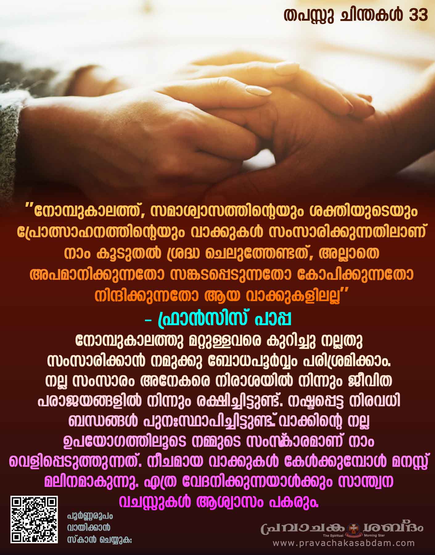 "നോമ്പുകാലത്ത്, സമാശ്വാസത്തിന്റെയും ശക്തിയുടെയും പ്രോത്സാഹനത്തിന്റെയും വാക്കുകൾ സംസാരിക്കുന്നതിലാണ് നാം കൂടുതൽ ശ്രദ്ധ ചെലുത്തേണ്ടത്, അല്ലാതെ അപമാനിക്കുന്നതോ സങ്കടപ്പെടുന്നതോ കോപിക്കുന്നതോ നിന്ദിക്കുന്നതോ ആയ വാക്കുകളിലല്ല" - ഫ്രാൻസിസ് പാപ്പ.