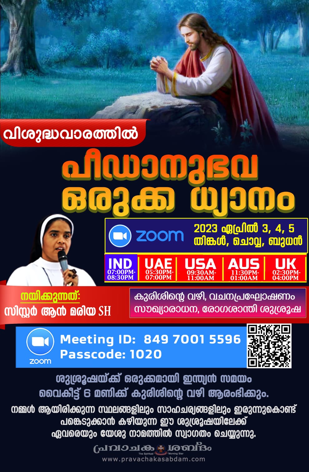 പ്രവാചകശബ്ദത്തിന്റെ ആഭിമുഖ്യത്തില് കഴിഞ്ഞ ഏതാനും മാസങ്ങളായി എല്ലാ ആദ്യവെള്ളിയാഴ്ചകളിലും സിസ്റ്റര് ആന് മരിയ ZOOM-ല് നയിക്കുന്ന ശുശ്രൂഷയില് കര്ത്താവിന്റെ ജീവിക്കുന്ന സാന്നിധ്യത്തെ വീണ്ടും സ്ഥിരീകരിച്ച് വലിയ അത്ഭുതങ്ങളും അടയാളങ്ങളും സംഭവിച്ചത് അനേകര് സാക്ഷ്യപ്പെടുത്തിയിരിന്നു. ഇതിന്റെ തുടര്ച്ചയായി നടത്തപ്പെടുന്ന അനുഗ്രഹീതമായ പീഡാനുഭവ ഒരുക്ക ധ്യാനത്തിലേക്ക് ഏവരെയും യേശു നാമത്തില് സ്വാഗതം ചെയ്യുന്നു.