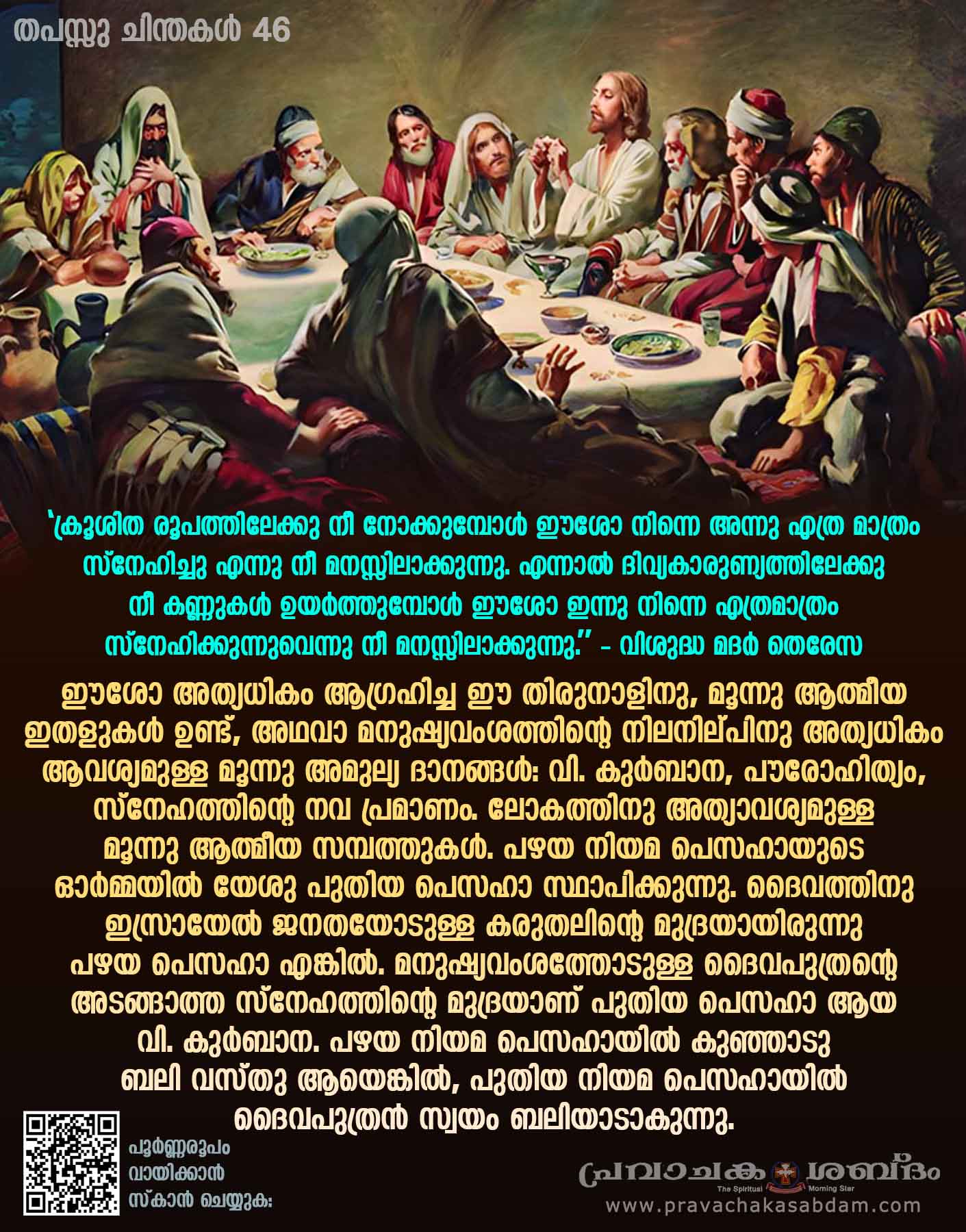 മനുഷ്യനോടൊപ്പമായിരിക്കാൻ ദൈവം അത്യധികം ആഗ്രഹിച്ച ദിനത്തിന്റെ പേരാണു പെസഹാ എങ്കിൽ, ദൈവത്തോടൊപ്പമായിക്കാൻ മനുഷ്യൻ തീരുമാനമെടുക്കേണ്ട പുണ്യദിനമാണിന്ന്. പാവങ്ങളുടെ അമ്മയായ കൽക്കത്തയിലെ വി. മദർ തേരേസാ നമ്മെ ഓർമിപ്പിക്കുന്നു: “ക്രൂശിത രൂപത്തിലേക്കു നീ നോക്കുമ്പോൾ ഈശോ നിന്നെ അന്നു എത്ര മാത്രം സ്നേഹിച്ചു എന്നു നീ മനസ്സിലാക്കുന്നു. എന്നാൽ ദിവ്യകാരുണ്യത്തിലേക്കു നീ കണ്ണുകൾ ഉയർത്തുമ്പോൾ ഈശോ ഇന്നു നിന്നെ എത്രമാത്രം സ്നേഹിക്കുന്നുവെന്നു നീ മനസ്സിലാക്കുന്നു.” ദൈവസ്നേനേഹത്തിനു വിശുദ്ധ കുർബാന അർപ്പണത്തിലുടെ പ്രത്യുത്തരം നൽകുക. വിശുദ്ധ കുർബാനയെ അധിക്ഷേപിക്കുന്ന അപമാനിക്കുന്ന ആധുനിക സംസ്കാരത്തിൽ ദൈവത്തിന്റെ അത്യധിക ആഗ്രഹമായ വി.കുർബാനയുടെ ശോഭയെ നമുക്കു ഉയർത്തിപ്പിടിക്കാം.