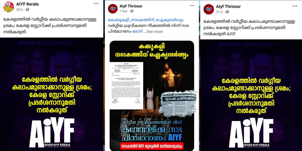 'കക്കുകളി' നാടകത്തിന് ഐക്യദാർഢ്യം, 'കേരള സ്റ്റോറി'യ്ക്ക് എതിരെ പ്രതിഷേധം: എഐവൈഎഫിന്റെ ഇരട്ടത്താപ്പ് പുറത്ത്