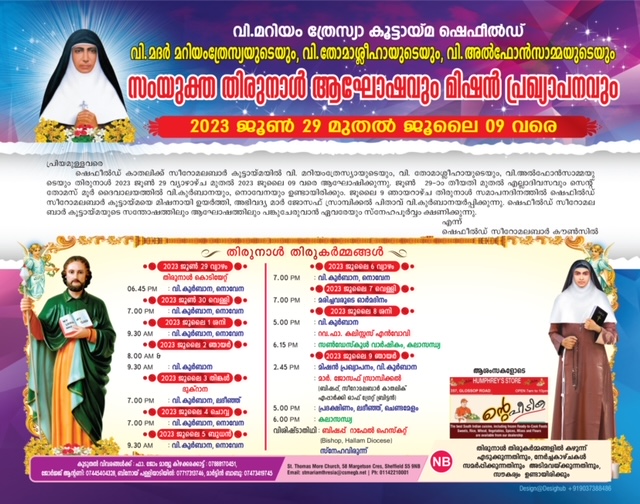 ഷെഫീൽഡ് സീറോ മലബാർ കമ്മ്യൂണിറ്റിയുടെ ചിരകാല സ്വപ്ന സാക്ഷാത്കാരമെന്നോണം കുടുംബ പ്രേഷിതയായ വി. മദർ മറിയം ത്രേസ്സ്യയുടെ നാമധേയത്തിൽ ഗ്രേറ്റ് ബ്രിട്ടൻ സീറോ മലബാർ രൂപതയുടെ കീഴിൽ നാളെ ഷെഫീൽഡ് മിഷൻ യാഥാർഥ്യമാകും. ജൂൺ 29 ന് കൊടിയേറിയ തിരുനാളിന്റെ പ്രധാന ദിനവും മിഷൻ പ്രഖ്യാപനവും ഒരുമിക്കുന്ന പ്രത്യേക ശുശ്രൂഷകൾക്ക് ഗ്രേറ്റ് ബ്രിട്ടൻ സീറോ മലബാർ രൂപത ബിഷപ്പ് മാർ. ജോസഫ് സ്രാമ്പിക്കൽ മുഖ്യ കാർമ്മികനാകും. നിരവധി വൈദികരും സന്യസ്തരും പങ്കെടുക്കുന്ന ചടങ്ങിന് അനുഗ്രഹ സാന്നിധ്യമായിക്കൊണ്ട് ഷെഫീൽഡ് ഹാലം രൂപത ബിഷപ്പ് റാൽഫ് ഹെസ്കറ്റും എത്തിച്ചേരും. തലശ്ശേരി രൂപതാംഗമായ റവ. ഫാ. ജോസഫ് കിഴക്കരക്കാട്ടാണ് പുതിയ ഷെഫീൽഡ് മിഷന്റെ ആദ്യ ഡയറക്ടർ.