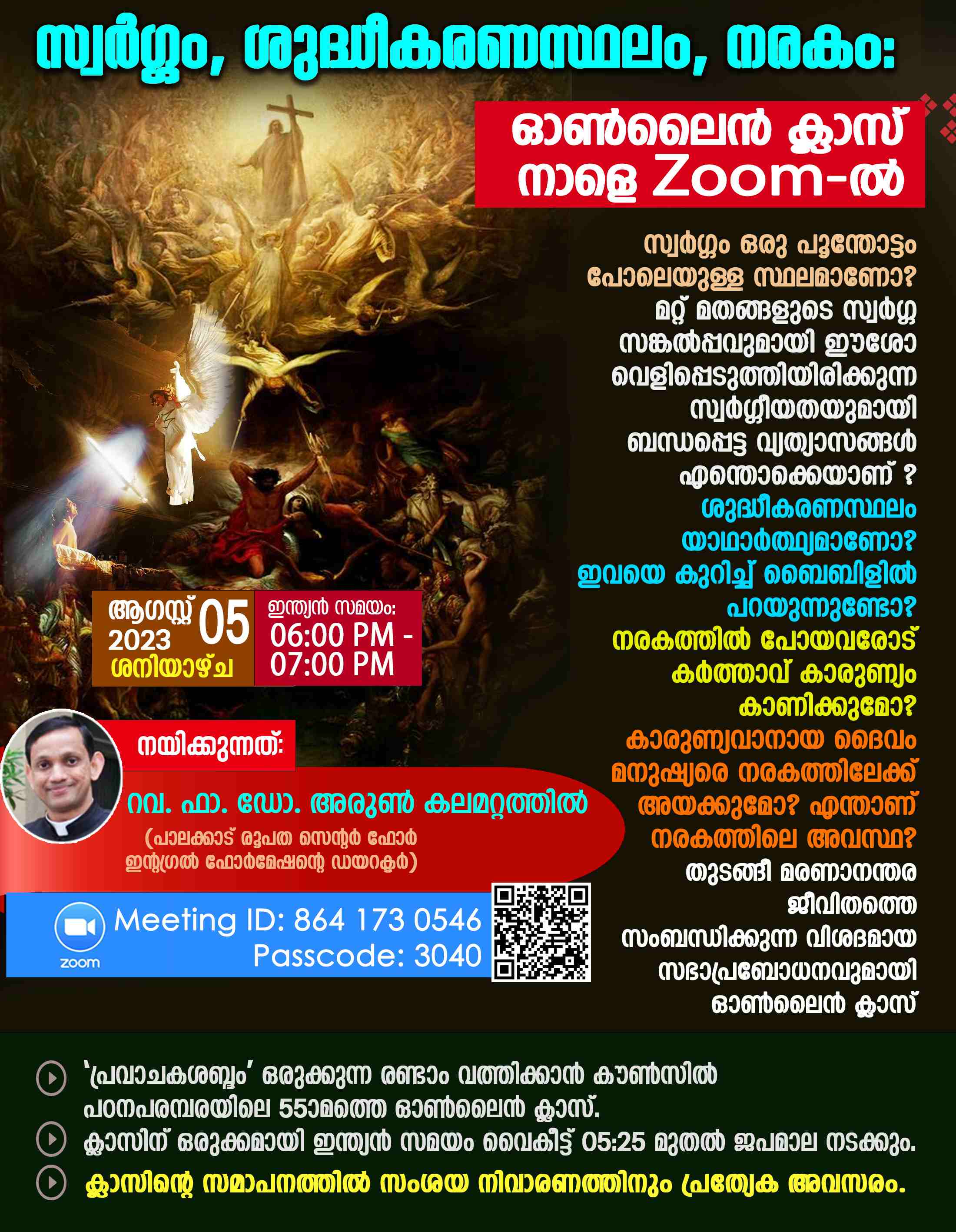 സ്വര്ഗ്ഗം ഒരു പൂന്തോട്ടം പോലെയുള്ള സ്ഥലമാണോ? മറ്റ് മതങ്ങളുടെ സ്വര്ഗ്ഗ സങ്കല്പ്പവുമായി ഈശോ വെളിപ്പെടുത്തിയിരിക്കുന്ന സ്വര്ഗ്ഗീയതയുമായി ബന്ധപ്പെട്ട വ്യത്യാസങ്ങള് എന്തൊക്കെയാണ് ? ശുദ്ധീകരണസ്ഥലം യാഥാര്ത്ഥ്യമാണോ? ഇവയെ കുറിച്ച് ബൈബിളില് പറയുന്നുണ്ടോ? നരകത്തില് പോയവരോട് കര്ത്താവ് കാരുണ്യം കാണിക്കുമോ? കാരുണ്യവാനായ ദൈവം മനുഷ്യരെ നരകത്തിലേക്ക് അയക്കുമോ? എന്താണ് നരകത്തിലെ അവസ്ഥ? തുടങ്ങീ മരണാനന്തര ജീവിതത്തെ സംബന്ധിക്കുന്ന വിവിധങ്ങളായ ചോദ്യങ്ങള്ക്കുള്ള ഉത്തരവുമായി ഓണ്ലൈന് ക്ലാസ് നാളെ ശനിയാഴ്ച (ആഗസ്റ്റ് 5, 2023) Zoom-ല് നടക്കും.