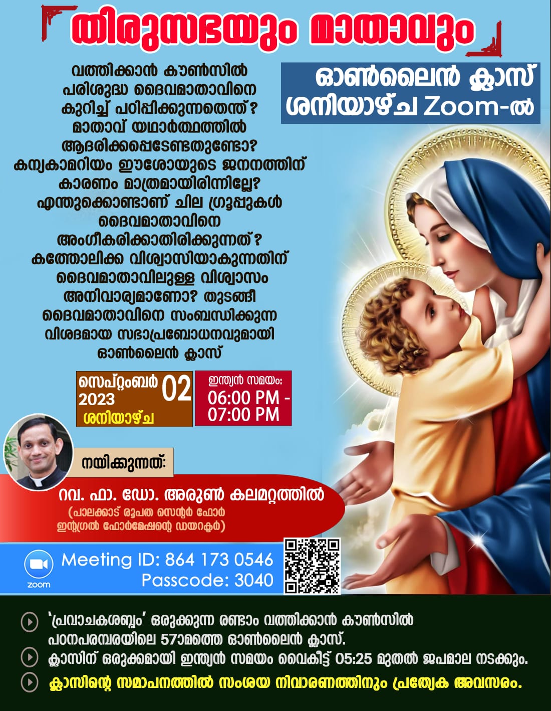 ക്ലാസിന് ഒരുക്കമായി ശനിയാഴ്ച (സെപ്റ്റംബര് 2) ഇന്ത്യന് സമയം വൈകീട്ട് 5.25നു ജപമാല ആരംഭിക്കും. തുടര്ന്നു 6 മണി മുതല് ക്ലാസ് നടക്കും. ഒരു മണിക്കൂര് നീളുന്ന ക്ലാസില് സംശയ നിവാരണത്തിനും പ്രത്യേക അവസരമുണ്ട്.