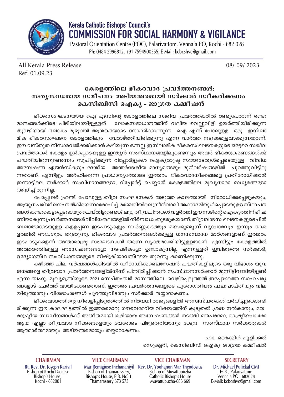 ഇസ്ലാമിക ഭീകര സംഘടന കേരളത്തിലും വേരാഴ്ത്തിയിരിക്കുന്നത് നിസാരവൽക്കരിക്കാൻ കഴിയില്ല: കെസിബിസി ജാഗ്രത കമ്മീഷൻ