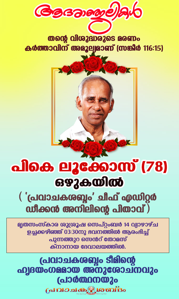 'പ്രവാചകശബ്ദം' ചീഫ് എഡിറ്റര് ഡീക്കന് അനിലിന്റെ പിതാവ് പികെ ലൂക്കോസ് നിര്യാതനായി