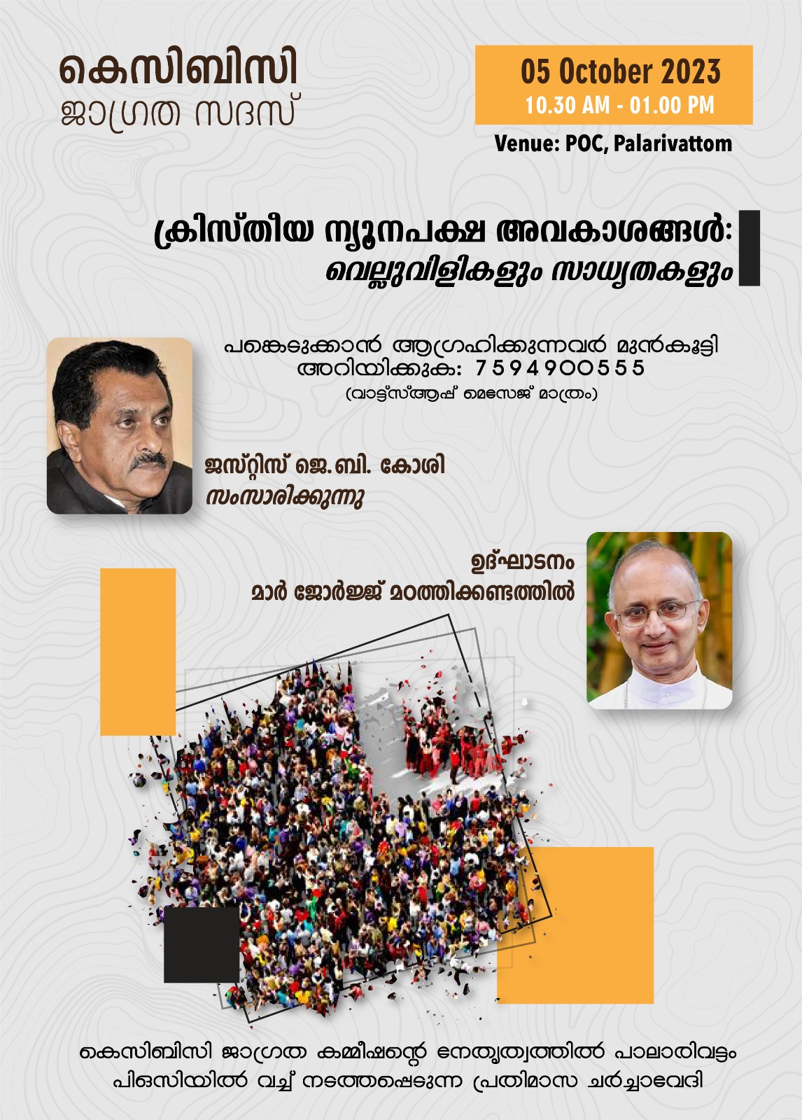ഒക്ടോബർ അഞ്ച് വ്യാഴാഴ്ച രാവിലെ 10. 30 ന് ആരംഭിക്കുന്ന പ്രോഗ്രാമിൽ ക്രൈസ്തവ പിന്നാക്കാവസ്ഥയെക്കുറിച്ച് പഠിക്കാൻ നിയോഗിക്കപ്പെട്ട പ്രത്യേക കമ്മീഷൻ ചെയർമാൻ ജസ്റ്റിസ് ജെ.ബി. കോശി പങ്കെടുത്ത് സംസാരിക്കുന്നതാണ്. സമുദായ - സംഘടനാ നേതാക്കളും പ്രമുഖ വ്യക്തികളും പങ്കെടുക്കുന്ന പ്രസ്തുത പരിപാടിയിൽ പങ്കെടുക്കാൻ താൽപ്പര്യമുള്ളവർക്ക് അതിനുള്ള അവസരം ഉണ്ടായിരിക്കും.