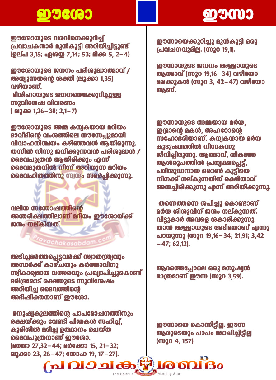 ബൈബിളിലെ ഈശോയും ഖുർആനിലെ ഈസായും തമ്മിലുള്ള വ്യത്യാസം മനസ്സിലാക്കാൻ താഴെ ചേർക്കുന്ന താരതമ്യപഠനം സഹായിക്കും.