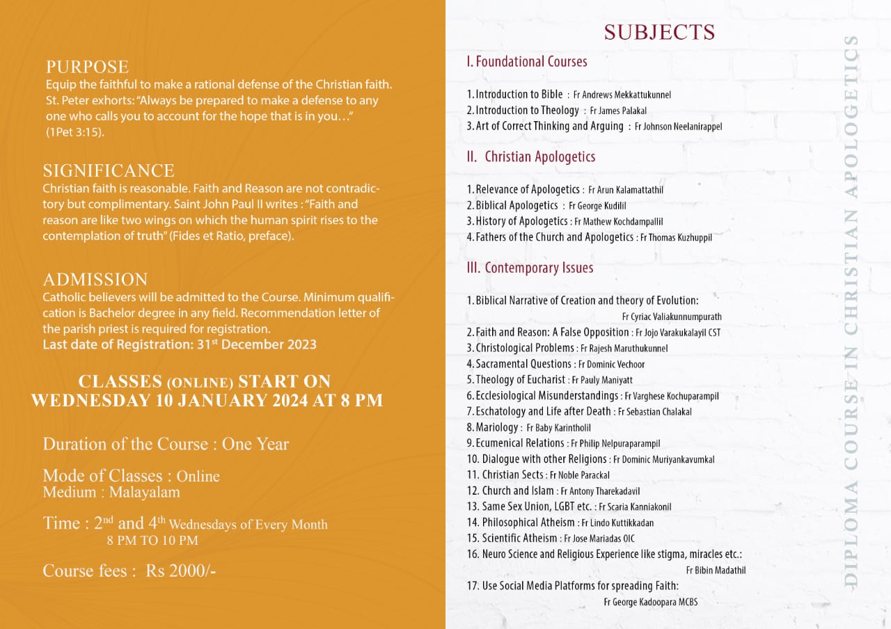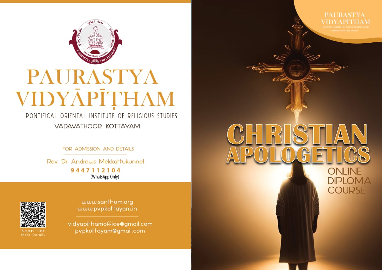 അല്മായരെ ക്രൈസ്തവ വിശ്വാസത്തില് ആഴപ്പെടുത്തുവാനും വിശ്വാസത്തിന് സാക്ഷ്യം നല്കാനും വിശ്വസിക്കുന്ന കാര്യങ്ങള് യുക്തിസഹമായി മറ്റുള്ളവരുടെ മുന്നില് അവതരിപ്പിക്കാനും സഹായിക്കുക എന്ന ലക്ഷ്യത്തോടെ 'ക്രിസ്ത്യന് അപ്പോളജറ്റിക്സ്' വിഷയത്തില് ഒരു വര്ഷം നീണ്ടു നില്ക്കുന്ന ഓണ്ലൈന് കോഴ്സിന് അപേക്ഷ ക്ഷണിച്ചു. കോട്ടയം വടവാതൂരിലെ പൊന്തിഫിക്കൽ ഓറിയന്റൽ ഇൻസ്റ്റിറ്റ്യൂട്ട് ഓഫ് റിലീജിയസ് സ്റ്റഡീസ് (പൗരസ്ത്യ വിദ്യാപീഠം) ആണ് ഓണ്ലൈന് കോഴ്സ് ഒരുക്കുന്നത്.