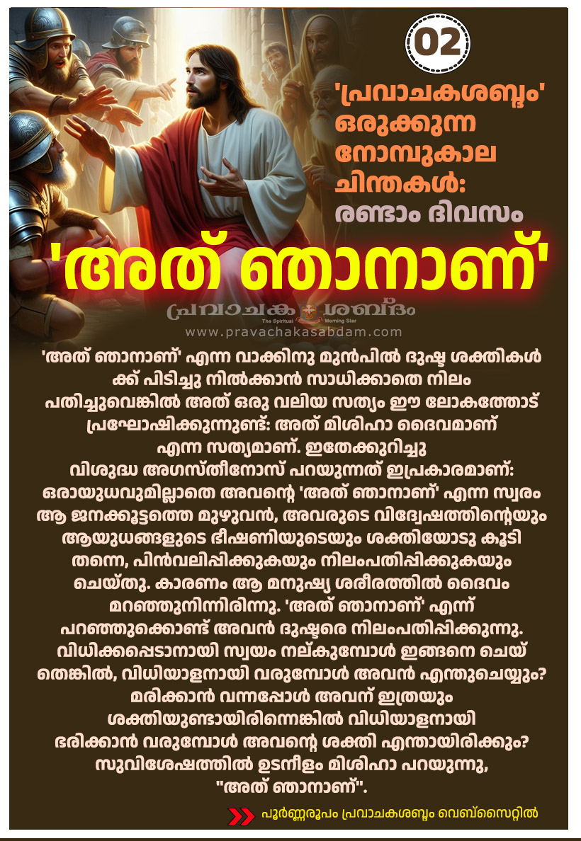 വിശുദ്ധ അഗസ്തീനോസ് പറയുന്നതുപോലെ സുവിശേഷത്തിലുടനീളം മിശിഹാ പറയുന്ന "അത് ഞാനാണ്" എന്ന സ്വരം കേൾക്കാൻ നമ്മുക്ക് സാധിക്കുന്നുണ്ടോ. ഈ നോമ്പുകാലം അതിനുള്ള ഒരു ഒരുക്കമായിരിക്കട്ടെ. നമ്മുടെ വേദനകളിലും തകർച്ചകളിലും തന്റെ സാന്നിധ്യം വെളിപ്പെടുത്തിക്കൊണ്ട് അവിടുന്നു പറയുന്നുണ്ട് "ഇത് ഞാനാണ്". മറ്റാരും നമ്മെ മനസ്സിലാക്കുന്നില്ല എന്നുള്ള നമ്മുടെ വേദനകളിൽ ഒറ്റപ്പെടലുകളിൽ, മറ്റാരോടും പങ്കുവെക്കുവാൻ കഴിയാത്ത വേദനകളിൽ, രോഗങ്ങളിൽ ഒക്കെ നാം ഉരുകുമ്പോൾ ഈശോ നമ്മോടു പറയുന്നുണ്ട് "ഇത് ഞാനാണ്" എന്ന്.