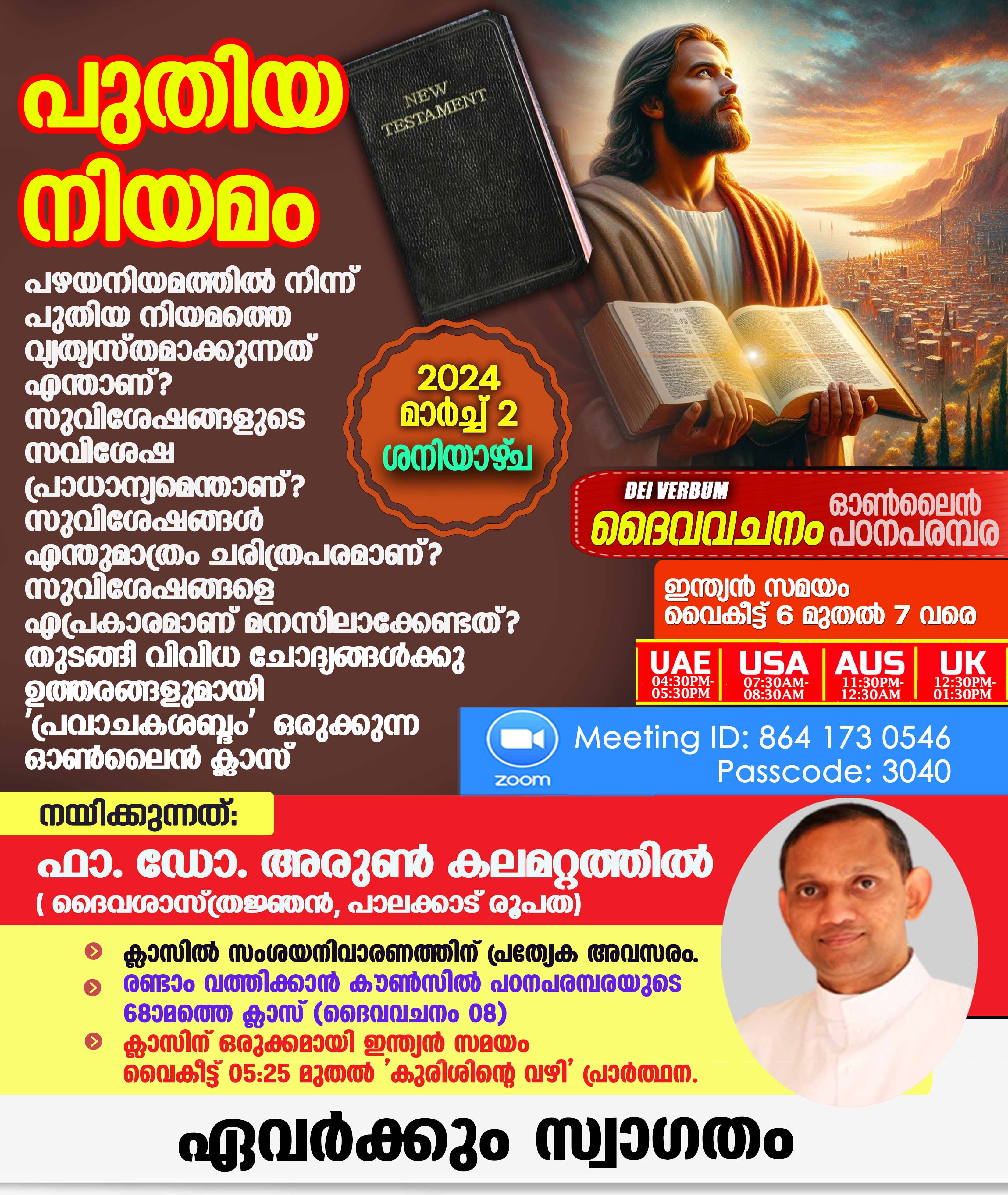പഴയനിയമത്തില് നിന്നു പുതിയ നിയമത്തെ വ്യത്യസ്തമാക്കുന്നത് എന്താണ്? സുവിശേഷങ്ങളുടെ സവിശേഷ പ്രാധാന്യമെന്താണ്? സുവിശേഷങ്ങള് എന്തുമാത്രം ചരിത്രപരമാണ്? സുവിശേഷങ്ങളെ എപ്രകാരമാണ് മനസിലാക്കേണ്ടത്? തുടങ്ങീ വിശുദ്ധ ഗ്രന്ഥത്തിലെ പുതിയ നിയമത്തെ സംബന്ധിക്കുന്ന വിവിധങ്ങളായ ചോദ്യങ്ങള്ക്കുള്ള ഉത്തരവുമായി ഓണ്ലൈന് ക്ലാസ് നാളെ ശനിയാഴ്ച (മാര്ച്ച് 02, 2024) Zoom-ല് നടക്കും.