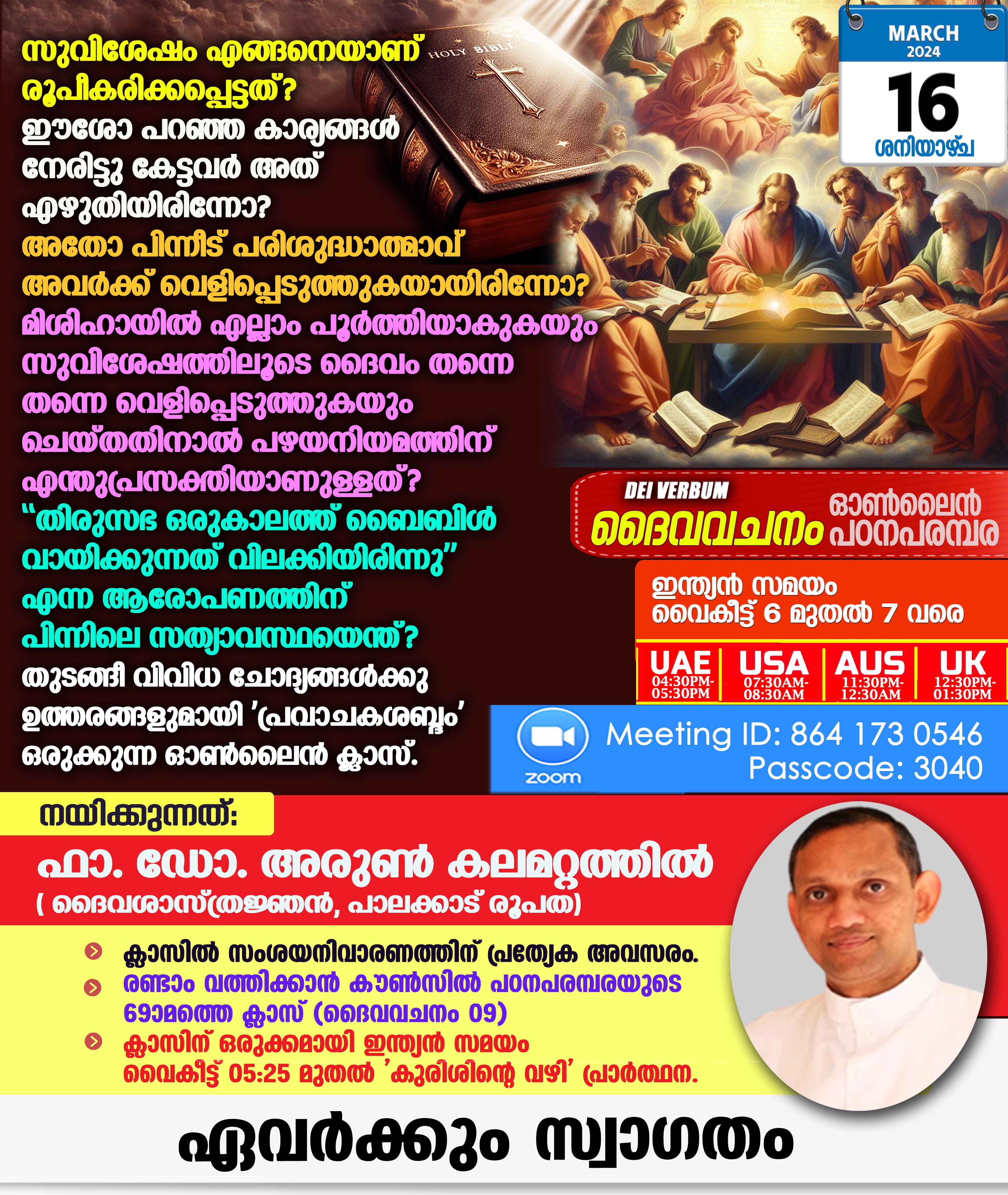 സുവിശേഷം എങ്ങനെയാണ് രൂപീകരിക്കപ്പെട്ടത്? ഈശോ പറഞ്ഞ കാര്യങ്ങള് നേരിട്ടു കേട്ടവര് അത് എഴുതിയിരിന്നോ? അതോ പിന്നീട് പരിശുദ്ധാത്മാവ് അവര്ക്ക് വെളിപ്പെടുത്തുകയായിരിന്നോ? മിശിഹായില് എല്ലാം പൂര്ത്തിയാകുകയും സുവിശേഷത്തിലൂടെ ദൈവം തന്നെ തന്നെ വെളിപ്പെടുത്തുകയും ചെയ്തതിനാല് പഴയനിയമത്തിന് എന്തുപ്രസക്തിയാണുള്ളത്? ''തിരുസഭ ഒരുകാലത്ത് ബൈബിള് വായിക്കുന്നത് വിലക്കിയിരിന്നു'' എന്ന ആരോപണത്തിന് പിന്നിലെ സത്യാവസ്ഥയെന്ത്? തുടങ്ങീ വിശുദ്ധ ഗ്രന്ഥത്തെ സംബന്ധിക്കുന്ന വിവിധങ്ങളായ ചോദ്യങ്ങള്ക്കുള്ള ഉത്തരവുമായി ഓണ്ലൈന് ക്ലാസ് ഇന്ന് ശനിയാഴ്ച (മാര്ച്ച് 16, 2024) Zoom-ല് നടക്കും.