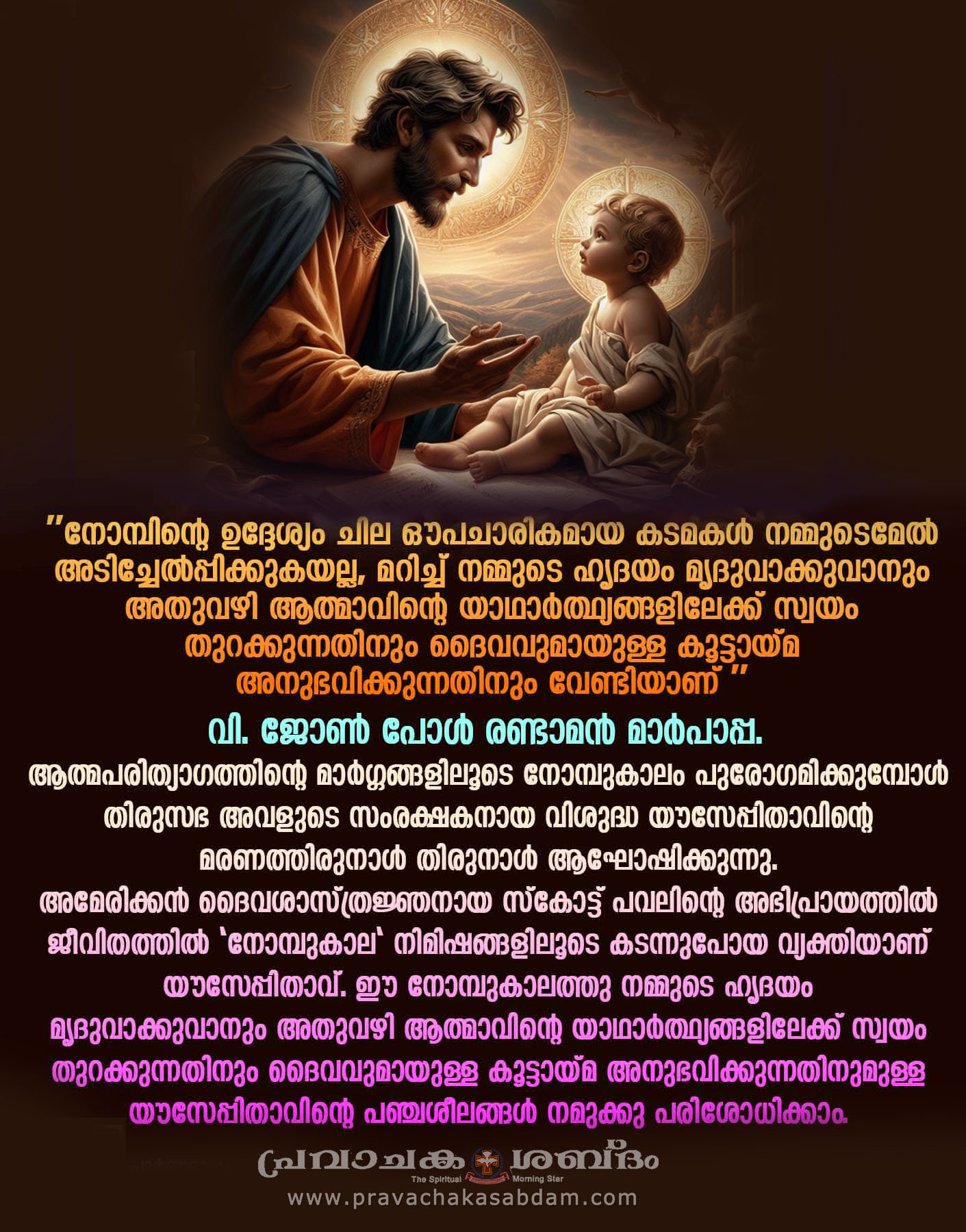 “നോമ്പിന്റെ ഉദ്ദേശ്യം ചില ഔപചാരികമായ കടമകൾ നമ്മുടെമേൽ അടിച്ചേൽപ്പിക്കുകയല്ല, മറിച്ച് നമ്മുടെ ഹൃദയം മൃദുവാക്കുവാനും അതുവഴി ആത്മാവിന്റെ യാഥാർത്ഥ്യങ്ങളിലേക്ക് സ്വയം തുറക്കുന്നതിനും ദൈവവുമായുള്ള കൂട്ടായ്മ അനുഭവിക്കുന്നതിനും വേണ്ടിയാണ് ” - വി. ജോൺ പോൾ രണ്ടാമൻ മാർപാപ്പ.