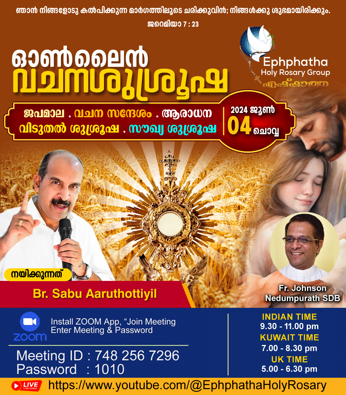കര്ത്താവിന്റെ ജീവിക്കുന്ന സാന്നിധ്യം ആയിരങ്ങള്ക്ക് മുന്നില് സൗഖ്യ ശുശ്രൂഷയിലൂടെ തുറന്നുക്കാണിച്ചിട്ടുള്ള പ്രമുഖ വചനപ്രഘോഷകൻ ബ്രദർ സാബു ആറുതൊട്ടി നയിക്കുന്ന വചനശുശ്രൂഷയും സൗഖ്യാരാധനയും ഇന്ന് ഓണ്ലൈനില് നടക്കും. 'എഫ്ഫാത്ത മിനിസ്ട്രി'യുടെ ആഭിമുഖ്യത്തില് ഇന്ന് ജൂണ് 4 ചൊവ്വാഴ്ച ഇന്ത്യന് സമയം രാത്രി 09:30 മുതല് 11 വരെയാണ് ശുശ്രൂഷ നടക്കുക. ജപമാല, വചന സന്ദേശം, ആരാധന, സൗഖ്യ വിടുതല് ശുശ്രൂഷ എന്നിവ ശുശ്രൂഷകളുടെ ഭാഗമായി നടക്കും.
