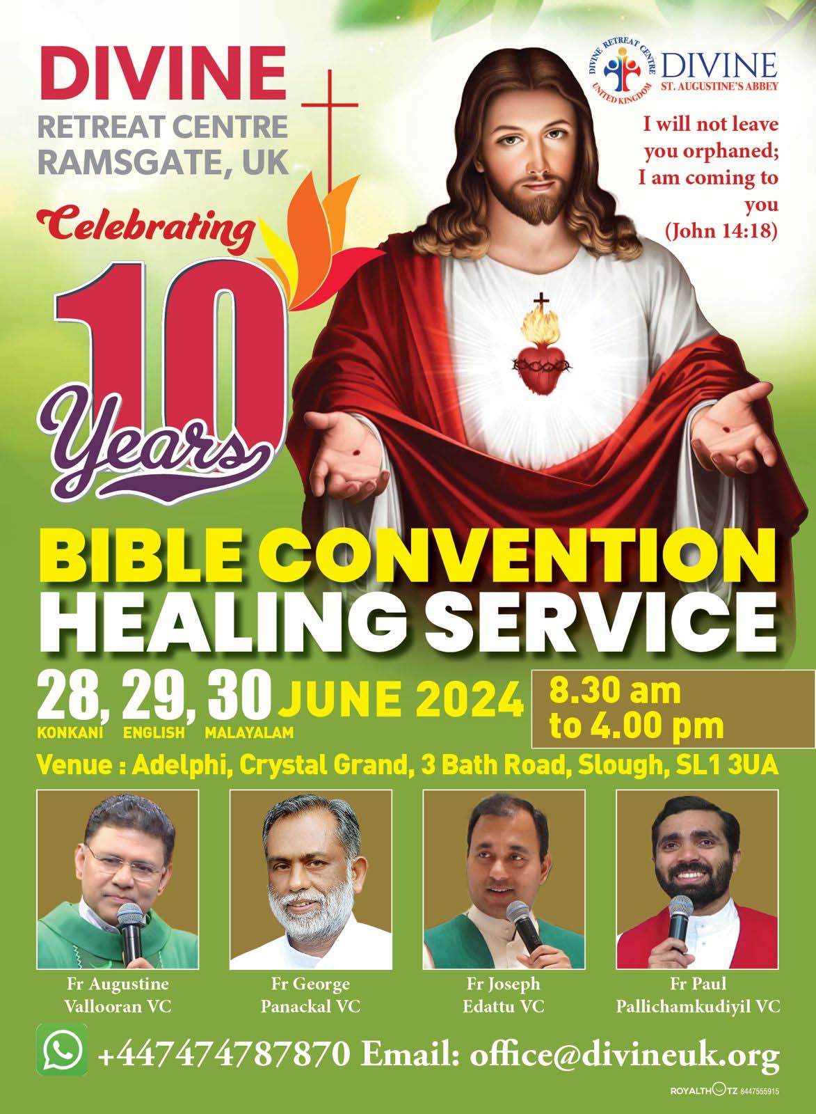ലണ്ടൻ: ആഗോളതലത്തിൽ ആയിരങ്ങളെ വിശ്വാസത്തിലേക്ക് നയിക്കുകയും, ബൈബിൾ കൺവെൻഷൻ-രോഗശാന്തി- ആന്തരിക സൗഖ്യ- പരിശുദ്ധാത്മ അഭിഷേക ശുശ്രുഷകളിലൂടെ സൗഖ്യവും ശാന്തിയും, വിശ്വാസവും പകർന്നു നൽകുന്ന വിൻസൻഷ്യൽ ധ്യാന കേന്ദ്രങ്ങളുടെ നേതൃത്വത്തിൽ യുകെയിൽ തിരുവചന ശുശ്രുഷകൾ ആരംഭിച്ചിട്ട് പത്തു വർഷങ്ങൾ പൂർത്തിയാവുന്നു. പത്താം വാർഷീകത്തിന്റെ നിറവിൽ യുകെ ഡിവൈൻ സെന്ററിന്റെ നേതൃത്വത്തിൽ വിവിധ ഭാഷകളിലായി ബൈബിൾ കൺവെൻഷനും, രോഗശാന്തി ശുശ്രുഷയും സ്ലോവിൽ വെച്ച് ജൂൺ 28,29,30 തീയതികളിലായി നടത്തുന്നതാണ്.