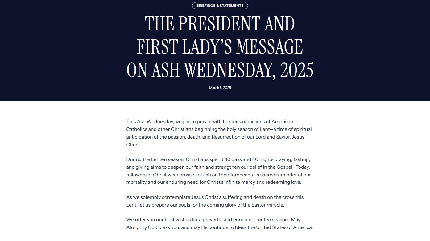 നോമ്പുകാലത്തില് ഞങ്ങളും പ്രാര്ത്ഥനയോടെ പങ്കുചേരുന്നു, സർവ്വശക്തനായ ദൈവം അനുഗ്രഹിക്കട്ടെ: ട്രംപിന്റെയും മെലാനിയയുടെയും വിഭൂതി സന്ദേശം