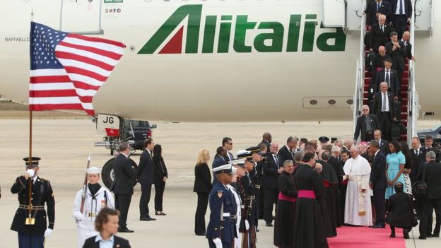 U.S , വത്തിക്കാൻ പതാകകൾ ഉയർത്തിയിരുന്ന അലിട്ടാലിയ വിമാനത്തിൽ നിന്നു പുറത്തേക്കിറങ്ങിയ മാർപാപ്പയെ സ്വീകരിക്കാൻ പ്രസിഡന്റ് ഒബാമയും ഭാര്യ മിഷേലും മക്കൾ സാഷയും മാലിയയും എത്തിച്ചേർന്നിരുന്നു.