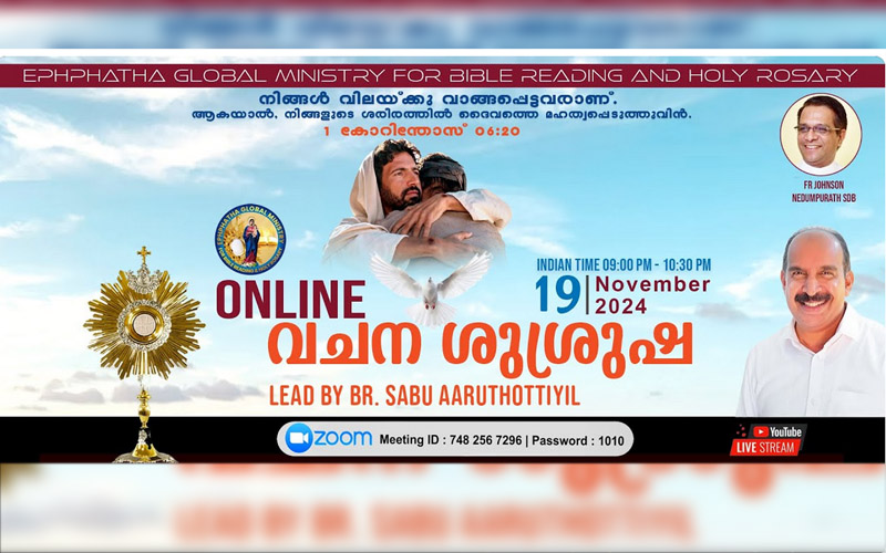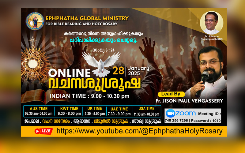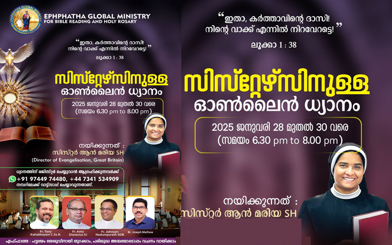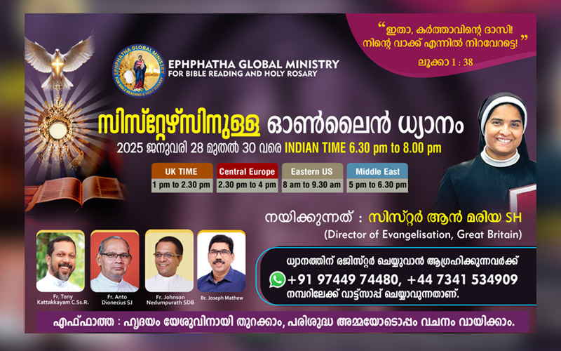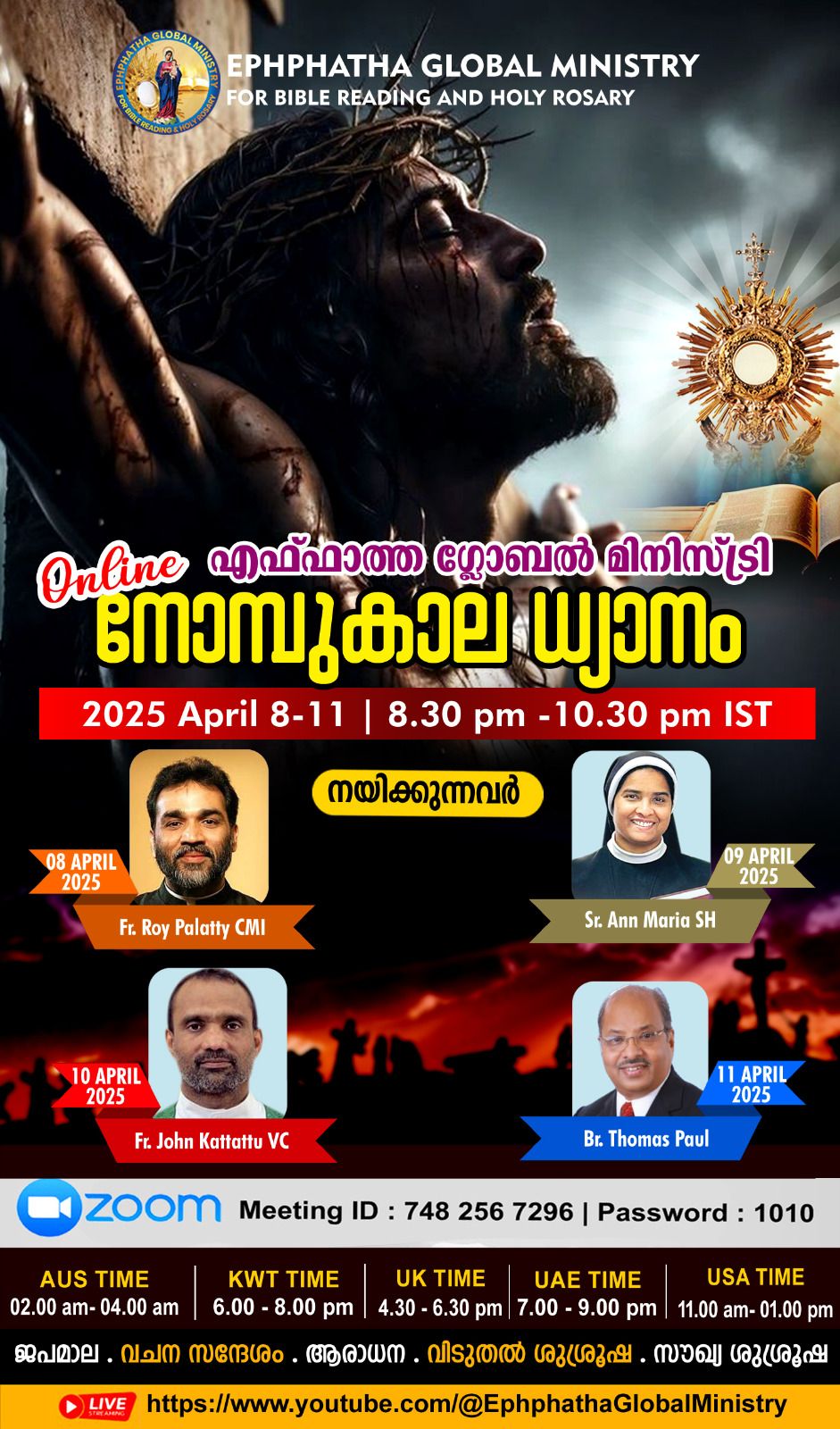 ക്രിസ്തു നാഥന്റ ഉയിർപ്പുതിരുനാളിനായി ഒരുങ്ങുന്ന വലിയ ആഴ്ചയ്ക്കു തയാറെടുക്കുമ്പോള് ആത്മീയമായി കൂടുതൽ ഒരുങ്ങുന്നതിനായി എഫ്ഫാത്ത ഗ്ലോബൽ മിനിസ്ട്രി ഒരുക്കുന്ന അനുഗ്രഹപ്രദമായ നോമ്പുകാല ധ്യാനം ഇന്നു മുതല് ഓണ്ലൈനില്. പ്രശസ്ത വചന പ്രഘോഷകരായ റവ. ഡോ. റോയ് പാലാട്ടി സിഎംഐ (ശാലോം മീഡിയ സ്പിരിച്വൽ ഡയറക്ടർ), സി. ആൻ മരിയ SH (ബ്രിട്ടനിലെ സീറോ മലബാർ സഭയുടെ സുവിശേഷവൽക്കരണ ഡയറക്ടർ), ഫാ. ജോൺ കാട്ടാട്ട് വിസി (അമേരിക്കയിലെ ഡിവൈൻ പ്രാർത്ഥനാലയം), ബ്ര. തോമസ് പോൾ (ജർമനിയിലെ കിങ്ഡം മിനിസ്ട്രി സ്ഥാപകൻ) തുടങ്ങിയവരാണ് ധ്യാനം നയിക്കുക.