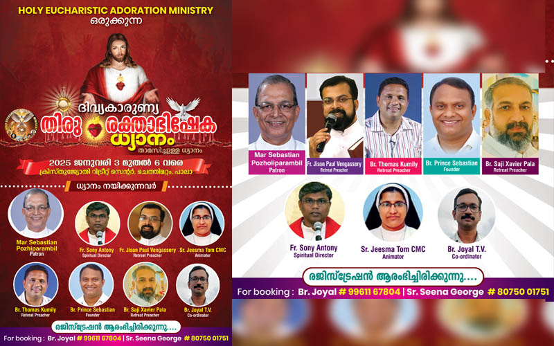 ഈ ലോകത്തിലെ ഏറ്റവും വലിയ മഹാഅത്ഭുതമായ ദിവ്യകാരുണ്യ നാഥനെ മുഴുവൻ സമയവും എഴുന്നള്ളിച്ചുവെച്ച് അവിടുത്തെ ആരാധിച്ചു കൊണ്ട് നടത്തപ്പെടുന്ന ധ്യാനം ആലുവ ജീവസ് റിട്രീറ്റ് സെന്ററില് ഒരുങ്ങുന്നു. ഹോളി യൂക്കാരിസ്റ്റിക് അഡോറേഷൻ മിനിസ്ട്രിയുടെ നേതൃത്വത്തിൽ ഏപ്രിൽ 24 മുതൽ 27 വരെ മാർ സെബാസ്റ്റ്യൻ പോഴോലിപറമ്പിലിന്റെ നേതൃത്വത്തിൽ നടക്കുന്ന തിരുരക്താഭിഷേക ധ്യാനത്തിന് ബുക്കിംഗ് ആരംഭിച്ചു.