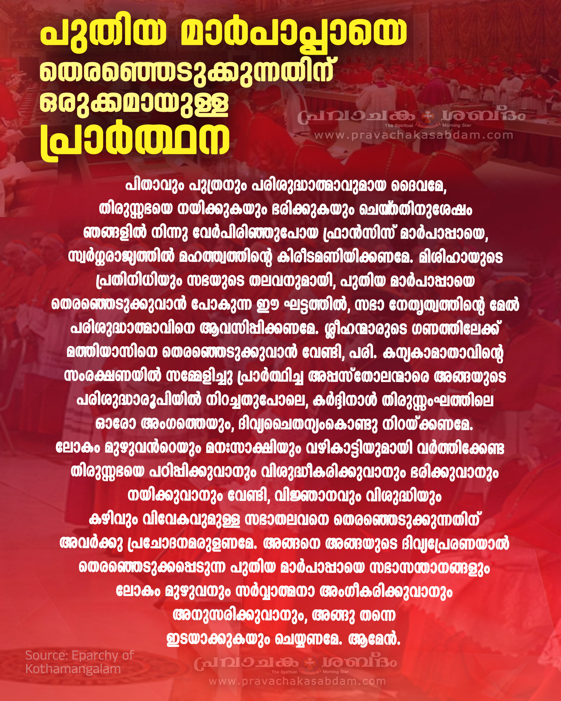 പുതിയ മാര്പാപ്പയുടെ തിരഞ്ഞെടുപ്പിൽ വോട്ട് ചെയ്യാൻ അവകാശമുള്ള 135 കർദ്ദിനാളുമാരിൽ ഫ്രാൻസിസ് മാര്പാപ്പ നിയമിച്ച 110 കർദ്ദിനാൾമാരുണ്ട് എന്നത് ശ്രദ്ധേയമാണ്. ഫ്രാൻസിസ് മാർപാപ്പയുടെ സാമൂഹിക നീതിയിലൂന്നിയതും സിനഡൽ സഭയെക്കുറിച്ചുള്ളതുമായ കാഴ്ചപ്പാടുകൾ ഈ തിരഞ്ഞെടുപ്പിൽ പ്രതിഫലിക്കാൻ സാധ്യതയുണ്ട്. തിരഞ്ഞെടുപ്പിൻ്റെ ഫലം എന്തായിരുന്നാലും, പരിശുദ്ധാത്മാവ് സഭയെ മുന്നോട്ട് നയിക്കും എന്നതിൽ നമുക്ക് ഉറച്ച വിശ്വാസമുണ്ട്. ഈ നിർണായക സമയത്ത് നമ്മുടെ പ്രധാന കർത്തവ്യം പ്രാർത്ഥന മാത്രമാണ്.