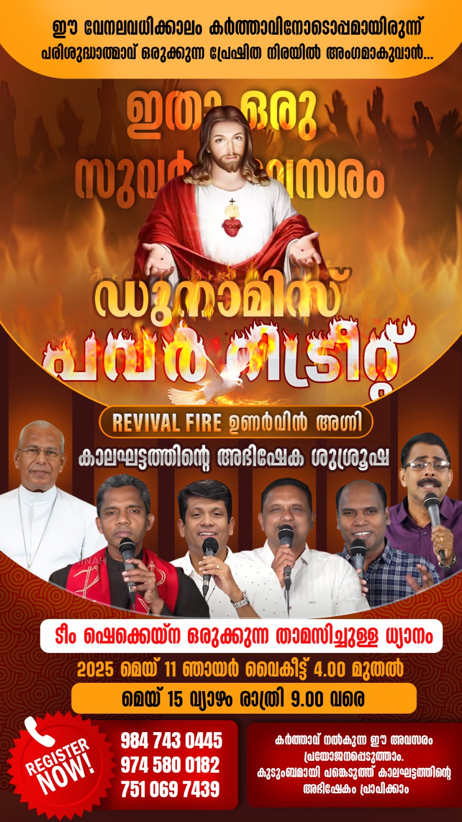 കാലത്തിന്റെ അടയാളങ്ങള് തിരിച്ചറിഞ്ഞ് ഈ തലമുറയിലെ വെല്ലുവിളികളെ അതിജീവിച്ചുകൊണ്ട് പരിശുദ്ധാത്മാവ് ഒരുക്കുന്ന പ്രേഷിതനിരയില് അണിചേര്ന്ന് കര്ത്താവിനും സഭയ്ക്കുമായി ധീരതയോടെ നിലകൊണ്ട് ദൈവവചനത്തിന് സാക്ഷ്യം നല്കുവാന് പ്രാപ്തമാക്കുന്ന കൃപയുടെ ശുശ്രൂഷയായ ഡുനാമിസ് പവര് റിട്രീറ്റില്, ഈ വേനലവധിക്കാലത്ത് കുടുംബമായി കടന്നു വന്ന് പങ്കെടുക്കാന് ഏവരെയും ക്ഷണിക്കുന്നതായി ബ്ര. സന്തോഷ് കരുമത്ര പറഞ്ഞു. മെയ് 11 ഞായര് വൈകീട്ട് 4.00 മണിക്ക് ആരംഭിക്കുന്ന ധ്യാനം മെയ് 15ന് രാത്രി 9.00 മണിക്ക് സമാപിക്കും. ധ്യാനത്തിന് മുന്കൂര് റെജിസ്റ്റര് ചെയ്യണം. ഫോണ്: 9847430445, 9745800182.