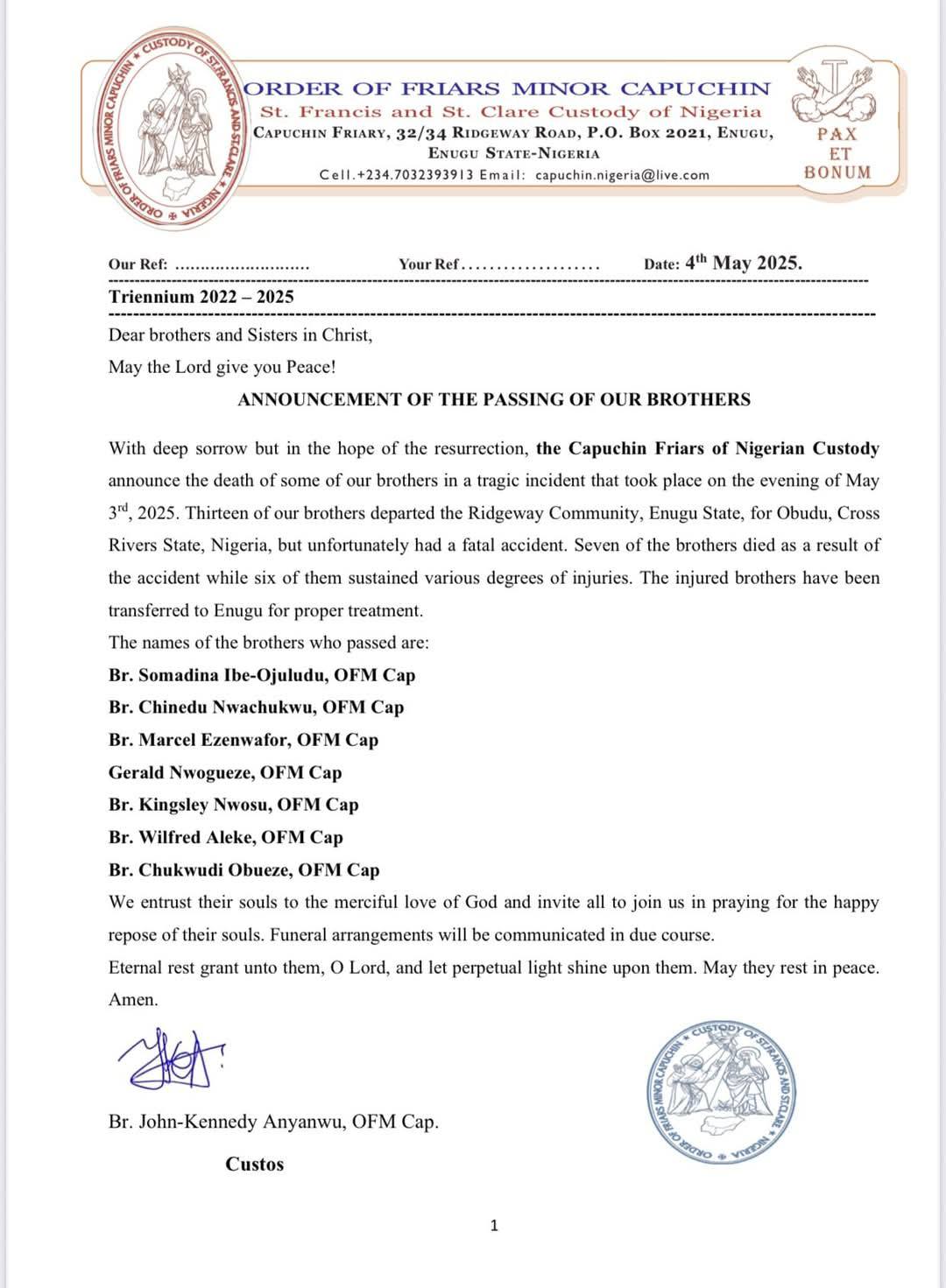 നൈജീരിയയിലെ കപ്പൂച്ചിൻ സമൂഹത്തിന്റെ ഉത്തരവാദിത്വമുള്ള ബ്രദർ ജോൺ-കെന്നഡി, സന്യാസിമാരുടെ മരണ വാര്ത്ത സ്ഥിരീകരിച്ചു. ബ്രദർ. സോമാഡിന ഇബെ-ഒജുലുഡു ഒഎഫ്എം, ബ്രദർ ചിനെഡു ന്വാചുക്വു ഒഎഫ്എം, ബ്രദർ. മാർസെൽ എസെൻവാഫോർ, , ബ്രദർ. ജെറാൾഡ് ന്യൂവോഗീസ് ഒഎഫ്എം, ബ്രദർ കിംഗ്സ്ലി ന്യൂസോസു ഒഎഫ്എം, ബ്രദർ. വിൽഫ്രഡ് അലെക്കെ ഒഎഫ്എം ബ്രദർ. ചുക്വുഡി ഒബ്യൂസ് എന്നിവരാണ് മരണപ്പെട്ടത്.
