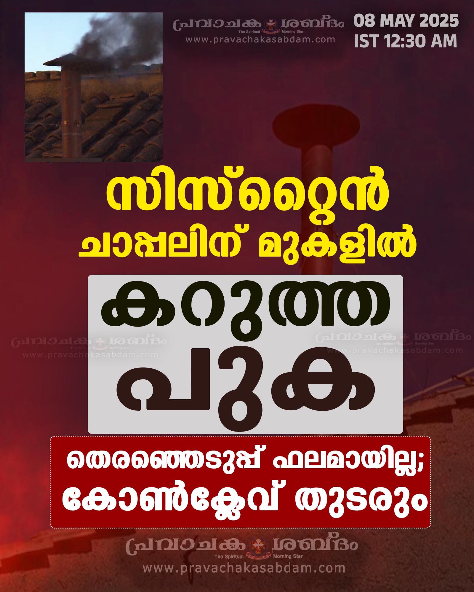 സിസ്റ്റൈന് ചാപ്പലിന് മുകളില് കറുത്ത പുക; തെരഞ്ഞെടുപ്പ് ഫലമായില്ല, കോണ്ക്ലേവ് തുടരും