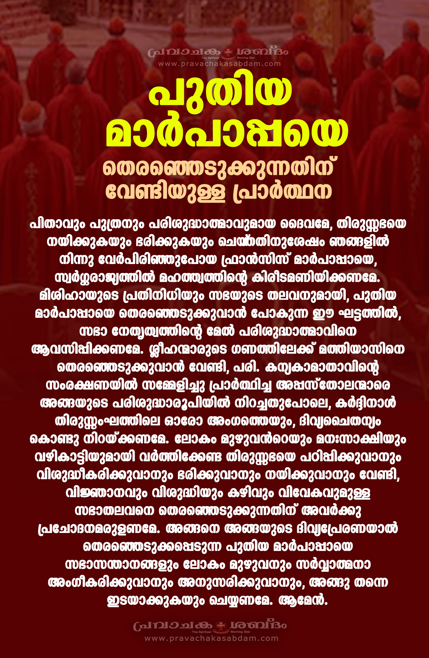 ലോകത്തിന്റെ രക്ഷകനും നാഥനുമായ യേശു ക്രിസ്തുവിന്റെ കാണപ്പെടുന്ന പ്രതിനിധിയെയാണ് സിസ്റ്റൈൻ ചാപ്പലിൽ ഇപ്പോൾ കണ്ടെത്തുന്നത്. അതാണ് കത്തോലിക്കാ സഭയുടെ തീരുമാനം. ദൈവത്തിന്റെ മനസ്സിൽ തീരുമാനിച്ച വ്യക്തിയെ, പരിശുദ്ധാത്മാവ് ഈ മണിക്കൂറിൽ 133 പിതാക്കന്മാർക്ക് വെളിപ്പെടുത്തുന്നു. മികച്ച അനേകരിൽ നിന്ന് ഏറ്റവും അനുയോജ്യമായ പരിശുദ്ധ പിതാവിന്റെ നാമം മുന്നിൽ രണ്ട് ഭൂരിപക്ഷം പേര് എഴുതി കഴിയുമ്പോൾ വെളുത്ത പുക ഉയരും. ലോകത്തിന് വിശുദ്ധിയുടെ പ്രകാശം പരത്തുന്ന, പ്രത്യാശയുടെ വെളിച്ചം വിതറുന്ന ആ പിതാവിനെ കാണുവാൻ ഞാൻ ഇപ്പോഴും വത്തിക്കാൻ ചതുരത്തിൽ നിൽക്കുന്നു. കഴിഞ്ഞ ദിവസങ്ങളിലെ വിശുദ്ധ പത്രോസിന്റെ പള്ളിയിൽ പങ്കെടുത്ത് പ്രാർത്ഥിച്ച വിശ്വാസത്തിൽ..!