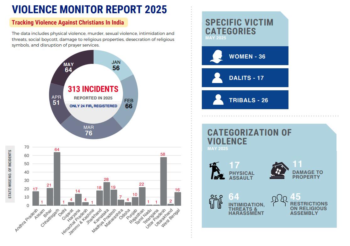 ഭാരതത്തിലെ ക്രൈസ്തവര്ക്ക് ഭീഷണി തുടര്ക്കഥ; 2025ലെ ആദ്യ 5 മാസങ്ങളിൽ മുന്നൂറിലധികം ക്രൈസ്തവ വിരുദ്ധ ആക്രമണങ്ങൾ
