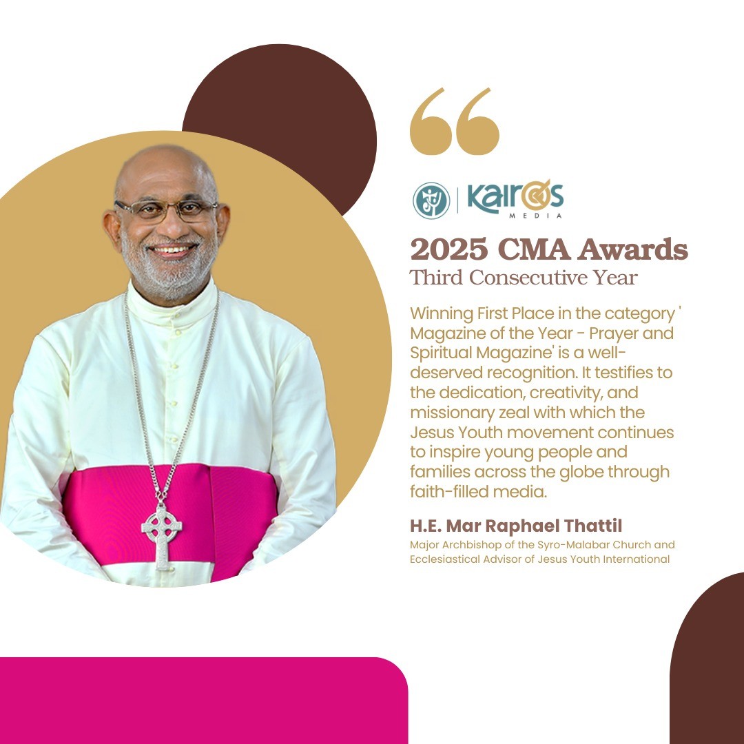 അന്താരാഷ്ട്ര യുവജന മുന്നേറ്റമായ ജീസസ് യൂത്ത് പ്രസിദ്ധീകരിക്കുന്ന, യുവജനങ്ങൾക്കും യുവ കുടുംബങ്ങൾക്കുമായുള്ള കത്തോലിക്കാ മാസികയായ കെയ്റോസ് ഗ്ലോബലിന് മൂന്നാം തവണയും സിഎംഎ അവാർഡ്. ജീസസ് യൂത്ത് മുന്നേറ്റത്തിന്റെ മാധ്യമ വിഭാഗമാണ് കെയ്റോസ് മീഡിയ. 2022 ൽ സിഎംഎയിൽ അംഗമായതിനുശേഷം സിഎംഎയുടെ അവാർഡ് കരസ്ഥമാക്കി കെയ്റോസ് മീഡിയയുടെ ഗ്ലോബൽ മാസിക അംഗീകാരത്തിന് അർഹമാകുന്നത് തുടർച്ചയായ മൂന്നാം വർഷമാണ്.