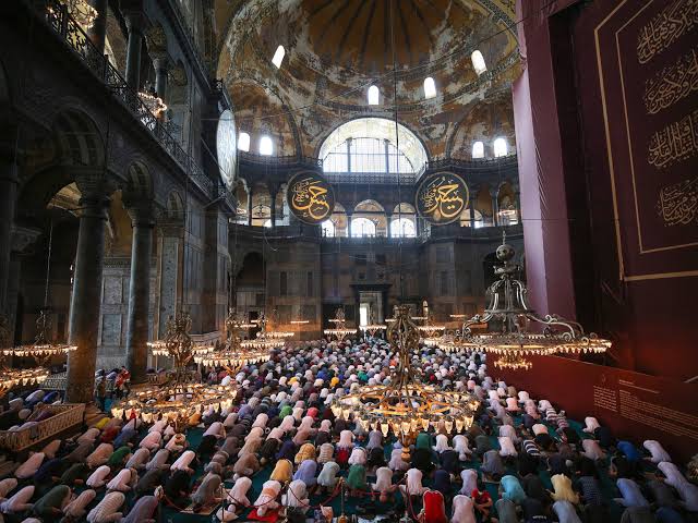 2020 ജൂലൈ 24നു ആദ്യമായി ഈ പുണ്യ പുരാതന ക്രൈസ്തവ ദേവാലയത്തില് ഇസ്ലാമിക നിസ്ക്കാരം നടന്നു. ഹാഗിയ സോഫിയയിലെ ക്രിസ്തീയ ചിത്രങ്ങള് തുണി ഉപയോഗിച്ച് മറച്ചുക്കൊണ്ടായിരിന്നു നിസ്ക്കാരം. (ഇപ്പോഴും അവ തുണി ഉപയോഗിച്ച് മറച്ചിരിക്കുകയാണ്) ഈ ദിവസം ഗ്രീക്ക് സഭയുടെ ആഹ്വാന പ്രകാരം വിലാപ ദിനമായാണ് ആചരിച്ചത്.