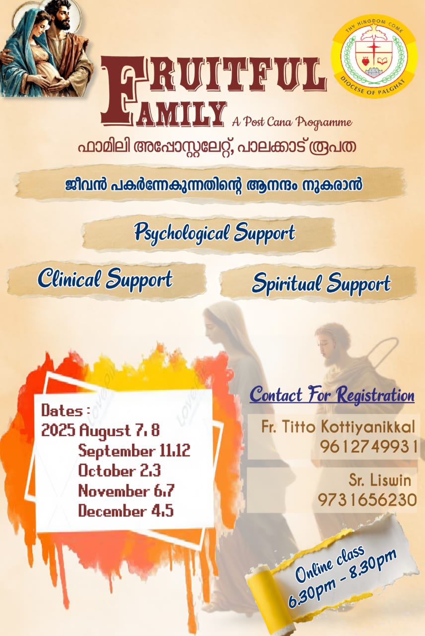 കൃപനിറഞ്ഞ കുഞ്ഞുങ്ങൾക്ക് ജന്മം നൽകാൻ ഗർഭിണികളെയും അവരുടെ കുടുംബാംഗങ്ങളെയും സഹായിക്കുന്നതിന് വേണ്ടി പ്രത്യേക ഓണ്ലൈന് പ്രോഗ്രാമുമായി പാലക്കാട് രൂപത ഫാമിലി അപ്പോസ്റ്റലേറ്റ്. FRUITFUL FAMILY: A Post Cana Programme എന്ന പേരില് ആരംഭിക്കുന്ന സെമിനാറിന് ഓഗസ്റ്റ് 8ന് തുടക്കമാകും. ഗർഭാവസ്ഥയിൽ ശ്രദ്ധിക്കേണ്ട ശാരീരിക- മാനസിക-ആത്മീയ വശങ്ങളെക്കുറിച്ച് അവബോധം നൽകി ദൈവഹിതപ്രകാരം ജീവിക്കാനും ജീവൻ പകർന്നേകുന്നതിന്റെ ആനന്ദം നുകരാനും സഹായിക്കുക എന്നതാണ് ഈ സെമിനാറിന്റെ ലക്ഷ്യം.