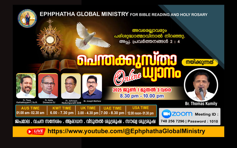 കര്ത്താവിന്റെ ജീവിക്കുന്ന സാന്നിധ്യം ആയിരങ്ങള്ക്ക് മുന്നില് സൗഖ്യ ശുശ്രൂഷയിലൂടെ തുറന്നുക്കാണിച്ചിട്ടുള്ള പ്രമുഖ വചനപ്രഘോഷകൻ ബ്രദർ സാബു ആറുതൊട്ടി നയിക്കുന്ന ത്രിദിന വിടുതല് ധ്യാനം ഇന്ന് മുതല് ഓണ്ലൈനില് നടക്കും. 'എഫ്ഫാത്ത മിനിസ്ട്രി'യുടെ ആഭിമുഖ്യത്തില് സെപ്റ്റംബര് 25, 26, 27 തീയതികളില് ഇന്ത്യന് സമയം രാത്രി 7 മുതല് 9 വരെയാണ് ZOOM-ല് ശുശ്രൂഷ നടക്കുക.