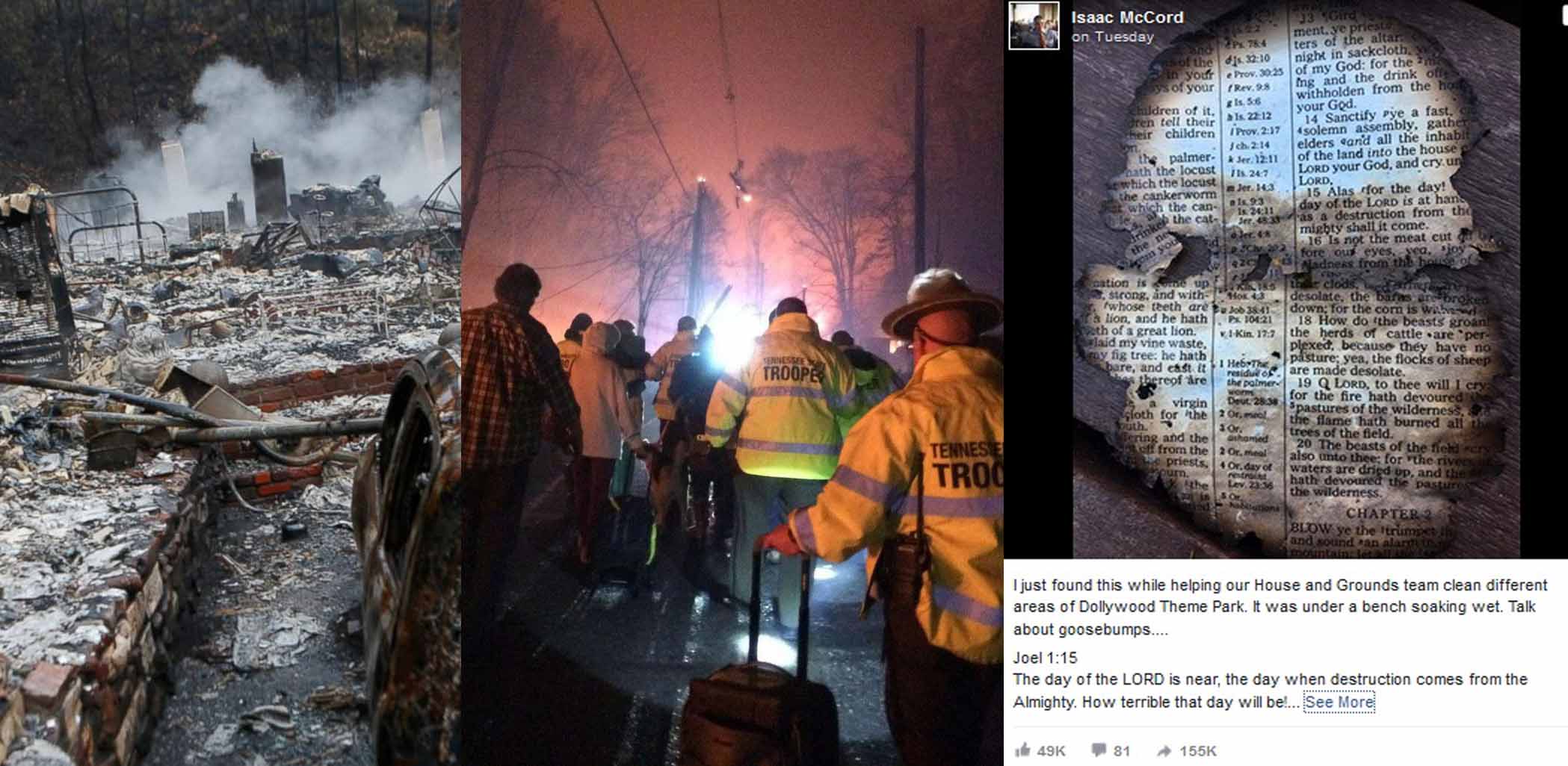 പ്രദേശത്ത് ആഴ്ചകളായി കാട്ടുതീ പടര്ന്നു പിടിക്കുകയാണ്. കെട്ടിടങ്ങളിലേക്കും ജനവാസ കേന്ദ്രത്തിലേക്കും പടരുന്ന തീ അണയ്ക്കുന്നതിനായി ശക്തമായ ശ്രമങ്ങളാണ് നടക്കുന്നത്. ഡോളിവുഡ് പാര്ക്കിലെ ഹ്യൂമന് റിസോഴ്സ് മാനേജറും സംഘവും തീ അണച്ച ഭാഗങ്ങൾ വൃത്തിയാക്കാൻ ശ്രമിക്കുമ്പോഴാണ് ബൈബിളിന്റെ പേജ് അവരുടെ ശ്രദ്ധയില് പെട്ടത്. ഒരു ബെഞ്ചിന്റെ അടിയില് വെള്ളം നനഞ്ഞ രീതിയിലാണ് ബൈബിളിന്റെ പേജുകള് കിടന്നിരുന്നത്. കത്തിനശിക്കാത്ത ഈ പേജിലെ വചനങ്ങള് വായിച്ച പാര്ക്കിലെ ജീവനക്കാര് അത്ഭുതപെട്ടു.