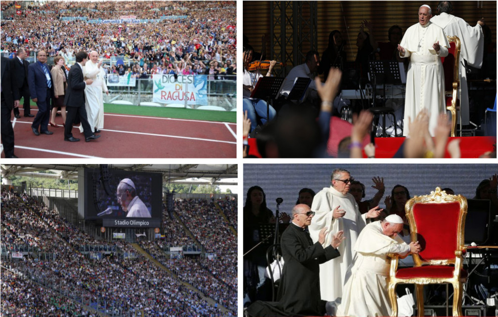 "Vive Jesus, El Senor," എന്ന സ്പാനീഷ് ഗാനാലാപനത്തോടെയാണ് ഒളിംബിക്ക് സ്റ്റേഡിയത്തിലെ പരിപാടികൾ തുടങ്ങിയത്. പിതാവ് കാരിസ്മാറ്റിക് ശൈലിയൽ കരങ്ങളുയർത്തി ഗാനാലാപനത്തിൽ പങ്കെടുത്തു. പണ്ട് ബ്യൂണസ് അയേർസിൽ കരിസ്മാറ്റിക് പ്രാർത്ഥനയിൽ, ദിവ്യബലിക്ക് ശേഷം തങ്ങൾ ഈ ഗാനം ആലപിച്ചിരുന്നു എന്ന് മാർപാപ്പ ഓർമ്മിച്ചു.