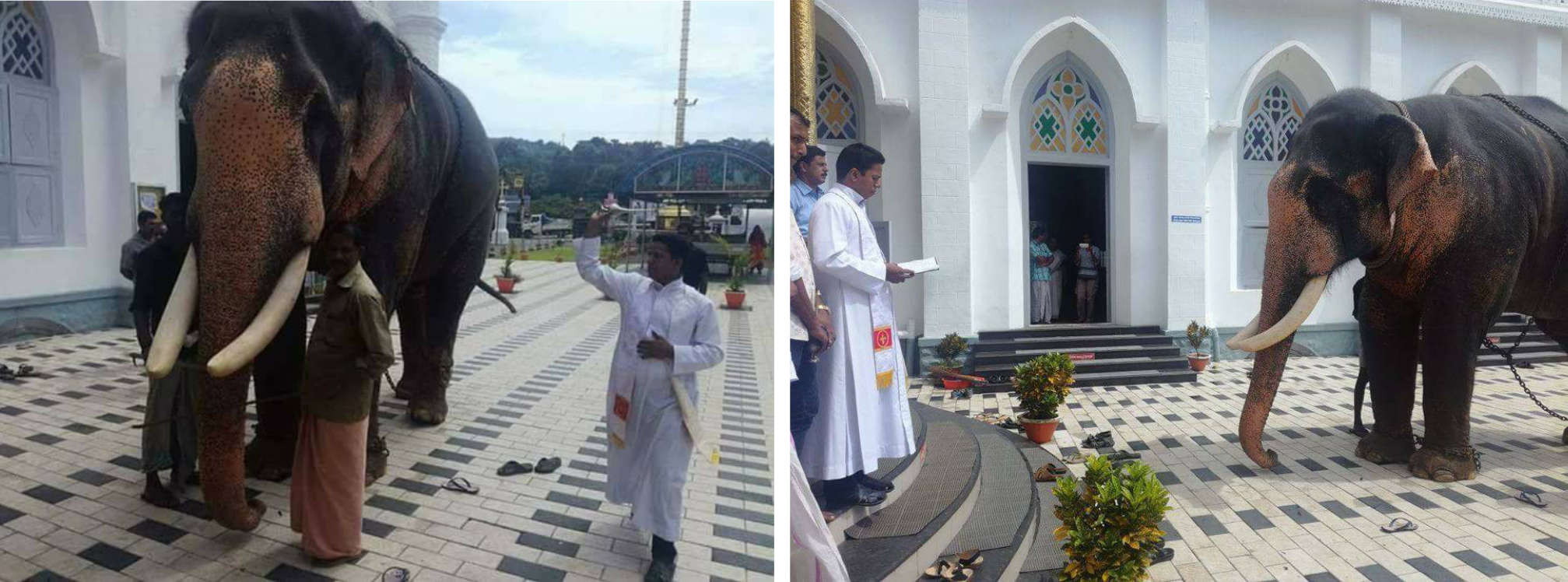 ആനയെ ആശീര്വദിക്കുന്ന വൈദികനും അത് അംഗീകരിക്കാത്ത വിശ്വാസികളും