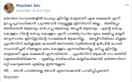 മതാന്തര സംവാദങ്ങളിൽ പോലും ക്രിസ്തു മാത്രമാണ് ഏക രക്ഷകൻ എന്ന് ഉറച്ചു പ്രസംഗിക്കാൻ പറ്റാത്തവൻ നട്ടെല്ലുള്ള ക്രിസ്താനി അല്ല... അതിപ്പോ അൽമായൻ ആയാലും മാർപാപ്പ ആയാലും അച്ചൻ ആയാലും.. എന്റെ മതവും കൊള്ളാം നിന്റെ മതവും കൊള്ളാം എന്ന് പറഞ്ഞു സ്വന്തം മുഖം രക്ഷിച്ചു കയ്യടി നേടുന്നവനും ക്രിസ്തുവിന്റെ സാക്ഷികൾ ആകുന്നില്ല.... അസ്സീസിയിലെ വിശുദ്ധ ഫ്രാൻസിസ് കുരിശുയുദ്ധ കാലത്ത് അന്നത്തെ സുൽത്താന്റെ മുൻപിൽ പോയി സംസാരിച്ചത് നിങ്ങളുടെ മതം കൊള്ളാം എന്നായിരുന്നില്ല, മറിച്ചു ക്രിസ്തു മാത്രമാണ് ഏക രക്ഷകൻ എന്നായിരുന്നു.... ഫ്രാൻസിസ് ആകാൻ നാം ഒത്തിരി വളരേണ്ടിയിരിക്കുന്നു.... എങ്കിലും താത്കാലിക കയ്യടികൾക്കായി കർത്താവിനെ ഒറ്റി കൊടുക്കാതെ എങ്കിലും ഇരുന്നുകൂടെ....