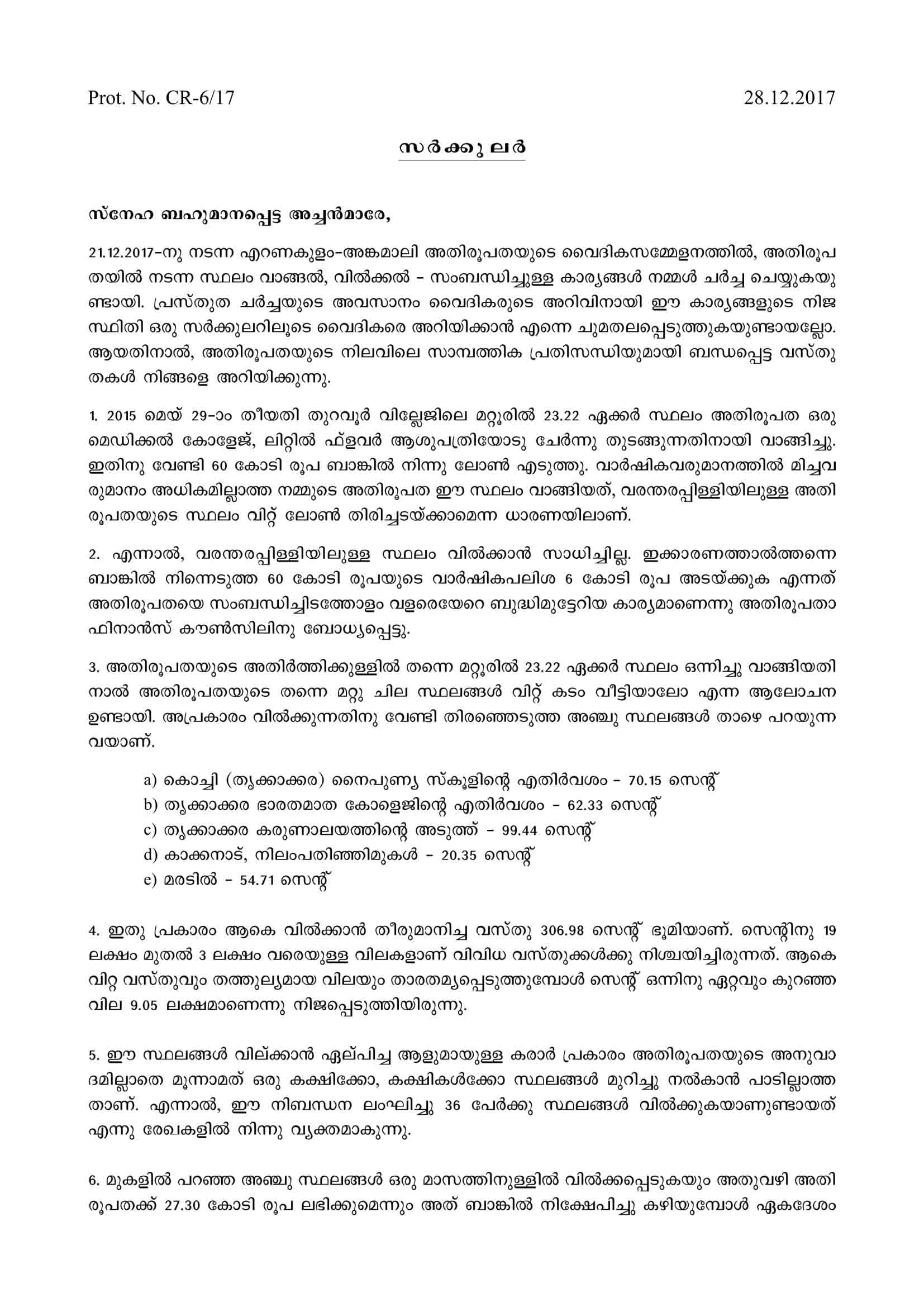 3. ഇത്രയും പ്ലോട്ടുകള് വില്ക്കാന് അതിരൂപത തീരുമാനിച്ചത് 27.30 കോടി രൂപക്കാണെന്നും അത് ബാങ്കില് നിക്ഷേപിച്ചതിന് ശേഷം ബാക്കി തുക ചക്കരപ്പറന്പ് ഷോപ്പിംഗ് കോംപ്ലക്സില് നിന്ന് ലഭിക്കുന്ന വാടകയിലൂടെയും മാറ്റും സാവധാനം അടച്ചുതീര്ക്കാന് അതിരൂപത തീരുമാനിച്ചിരുന്നുവെന്നും എടയന്ത്രത്ത് പിതാവ് സര്ക്കുലറില് എഴുതുന്നു.