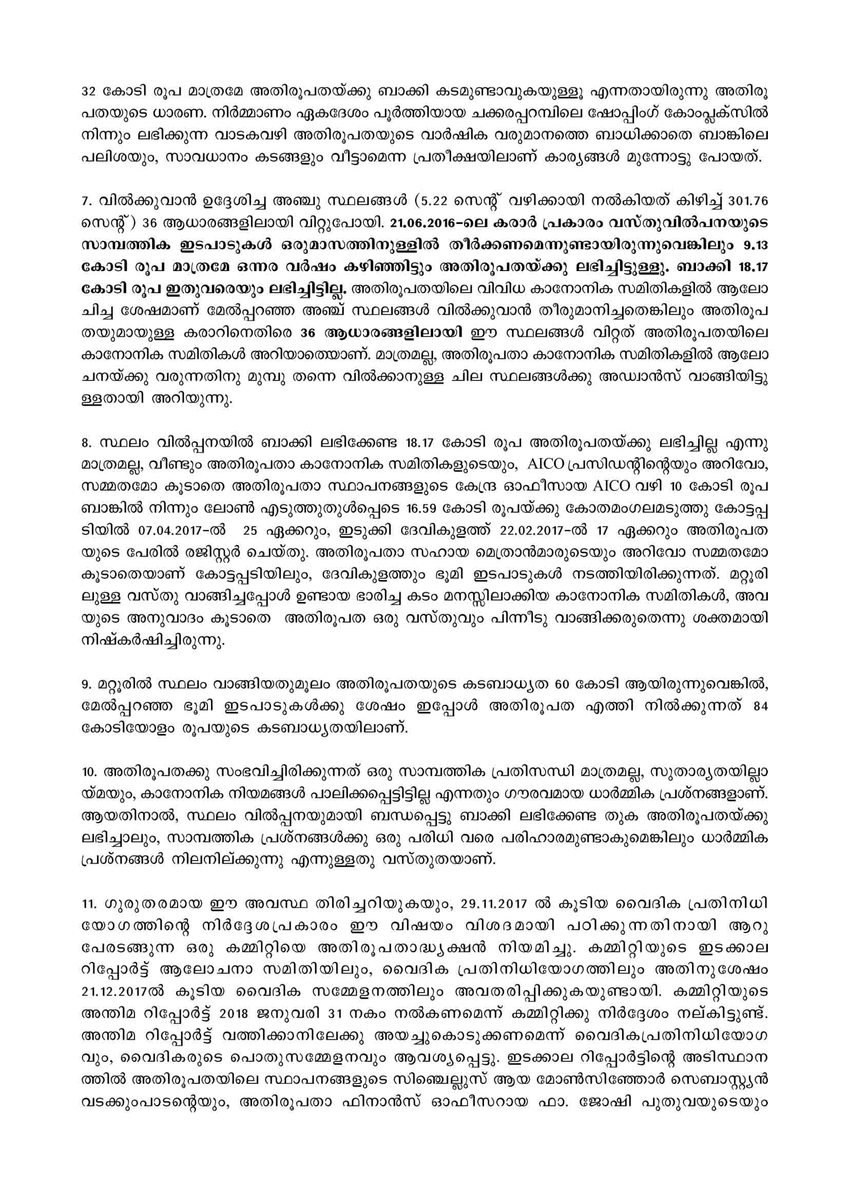1. മറ്റൂരിലെ 23.22 ഏക്കര് സ്ഥലം 60 കോടി കടമെടുത്ത് വാങ്ങിച്ചു.