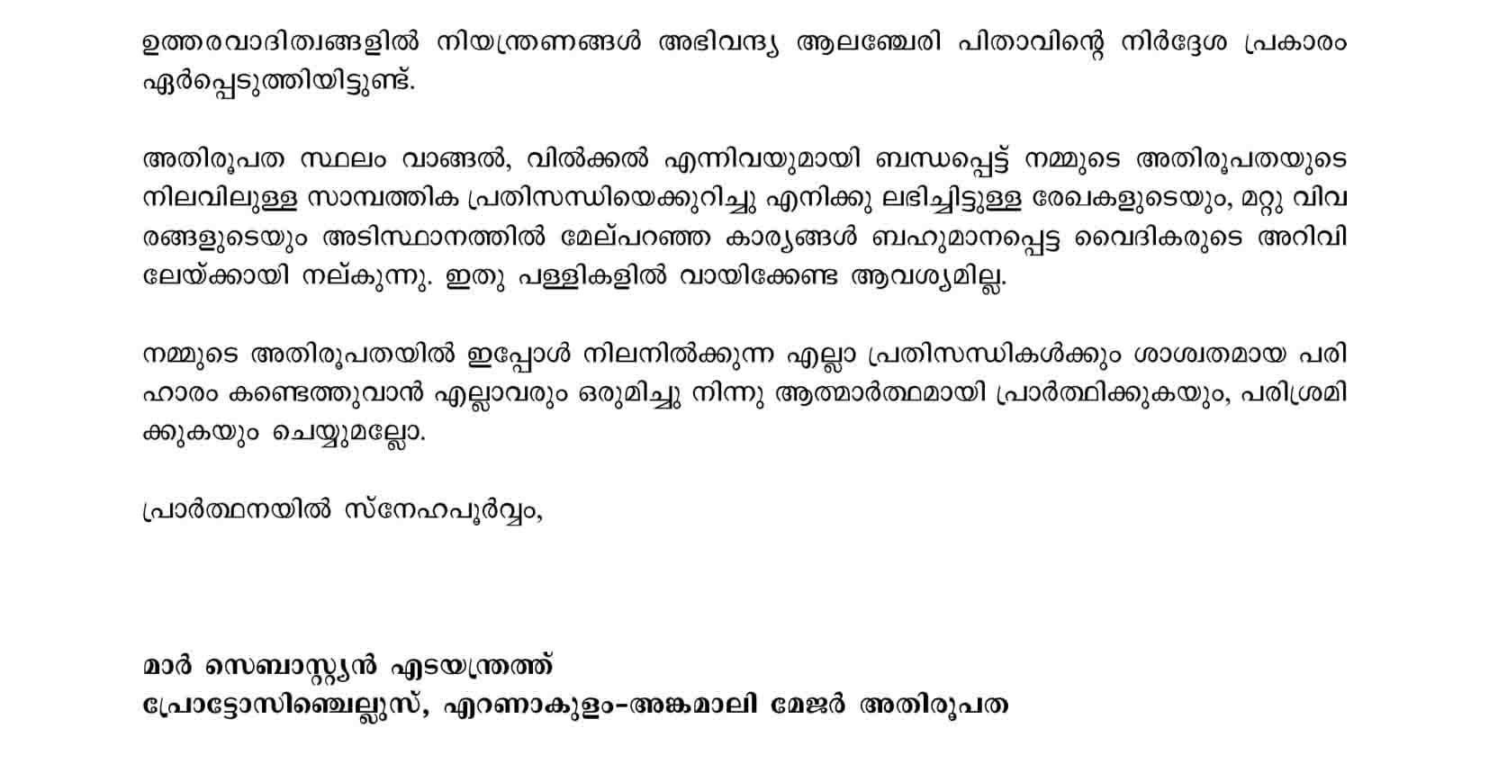 എറണാകുളം അതിരൂപതയുടെ സഹായമെത്രാന് എടയന്ത്രത്തു പിതാവിന്റെ സര്ക്കുലര്