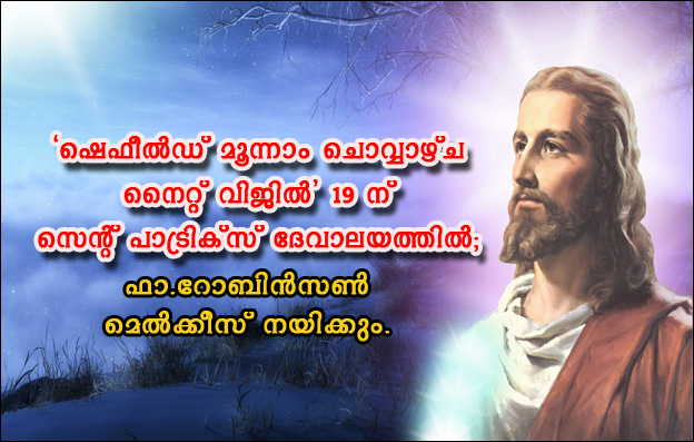 നോമ്പുകാല ഒരുക്കത്തിന്റെ ഭാഗമായി ഷെഫീൽഡിൽ അതിരമ്പുഴ കാരീസ്ഭവൻ ധ്യാനകേന്ദ്രം ഡയറക്ടർ ഫാ.കുര്യൻ കാരിക്കൽ നേതൃത്വം നൽകുന്ന "കെയ്റോസ് റിട്രീറ്റ്" ത്രിദിന ബൈബിൾ കൺവെൻഷൻ മാർച്ച് 4,5,6 തിയതികളിൽ ഷെഫീൽഡിലെ സെന്റ് പാട്രിക്സ് ദേവാലയത്തിൽ (Barnsley Road, S5 0QF) വച്ച് നടക്കും.