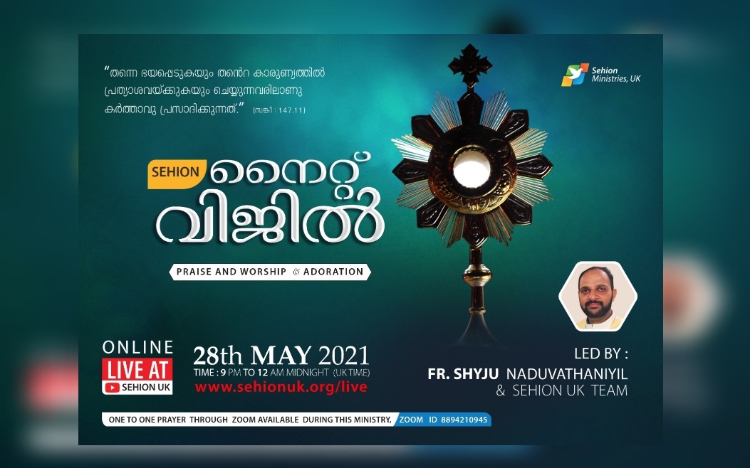 ഷെഫീൽഡിൽ എല്ലാ മാസവും ആദ്യവെള്ളിയാഴ്ചകളിൽ ഏറെ ആത്മീയ നവോന്മേഷമേകിക്കൊണ്ട് നടന്നുവരുന്ന നൈറ്റ് വിജിൽ സെന്റ് പാട്രിക് പള്ളിയിൽ വൈകിട്ട് 6 ന് ജപമാലയോടെ ആരംഭിച്ച് രാത്രി 9.30 നോടുകൂടി സമാപിക്കും. വി. കുർബാന, വചന പ്രഘോഷണം, ദിവ്യകാരുണ്യ ആരാധന തുടങ്ങിയവ നൈറ്റ് വിജിലിന്റെ ഭാഗമായി ഉണ്ടാകും. ഷെഫീൽഡ് കാത്തലിക് കമ്മ്യൂണിറ്റിക്കുവേണ്ടി ചാപ്ലയിൻ റവ. ഫാ. മാത്യു മുളയോലിൽ തിരുക്കർമ്മങ്ങളിലേക്ക് എല്ലാവരെയും സ്നേഹപൂർവ്വം ക്ഷണിക്കുന്നു.