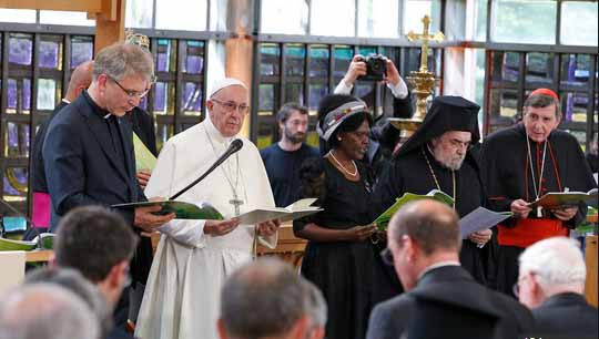 ഡബ്ല്യുസിസി സെക്രട്ടറി ജനറല് ഓലാവ് ഫിക്സെ ത്വൈതിന്റെ സ്വാഗതാശംസയെ തുടര്ന്നു അനുതാപശുശ്രൂഷ, അനുരഞ്ജന ഗാനാലാപനം, വചനപാരായണം എന്നിവ നടന്നു. തുടര്ന്നാണ് ഫ്രാന്സിസ് പാപ്പ സന്ദേശം നല്കിയത്. 1948- ല് രൂപീകരിച്ച സംഘടനയില് ഓര്ത്തഡോക്സ്, ആംഗ്ലിക്കന്, ലൂഥറന്, ബാപ്റ്റിസ്റ്റ്, മെത്തഡിസ്റ്റ് തുടങ്ങിയ വിഭാഗങ്ങള് അംഗങ്ങളാണ്. കത്തോലിക്ക സഭ സമിതിയില് അംഗമല്ലെങ്കിലും നിര്ദ്ദേശങ്ങള് നല്കാറുണ്ട്. 110 രാജ്യങ്ങളില് നിന്നായി 560 മില്ല്യന് ആളുകളെയാണ് 'ദി വേള്ഡ് കൗണ്സില് ഓഫ് ചര്ച്ചസ്' പ്രതിനിധീകരിക്കുന്നത്.