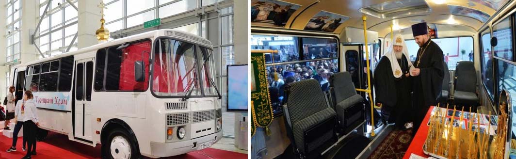 ഫാ. ആൻഡ്രയ് സ്റ്റെർലക്കോവ് എന്ന വെെദികനാണ് വിശുദ്ധ കുർബാന അർപ്പിക്കാൻ സാധ്യമായ രീതിയിൽ ബസ് രൂപകല്പ്പന ചെയ്തത്. ദേവാലയങ്ങള് ഇല്ലാത്ത മുപ്പതോളം ഗ്രാമ പ്രദേശങ്ങളില് ഏഴു വർഷമായി ഫാ. ആൻഡ്രയ് സ്റ്റെർലക്കോവ് തിരുകർമ്മങ്ങൾക്കായി പള്ളി ബസ് ഉപയോഗിക്കുന്നുണ്ട്. സേയിൻസ്ക് എന്ന ചെറിയ നഗരത്തിൽനിന്നും 1100 കിലോമീറ്റർ താണ്ടിയാണ് 'പള്ളി ബസ്' മോസ്കോയിലേ യുവജന സമ്മേളനം നടക്കുന്ന സ്ഥലത്തേയ്ക്ക് എത്തി ചേർന്നത്. സഞ്ചരിക്കുന്ന ദേവാലയം കാണുവാന് നിരവധി ആളുകളാണ് മോസ്കോയില് എത്തിയത്.