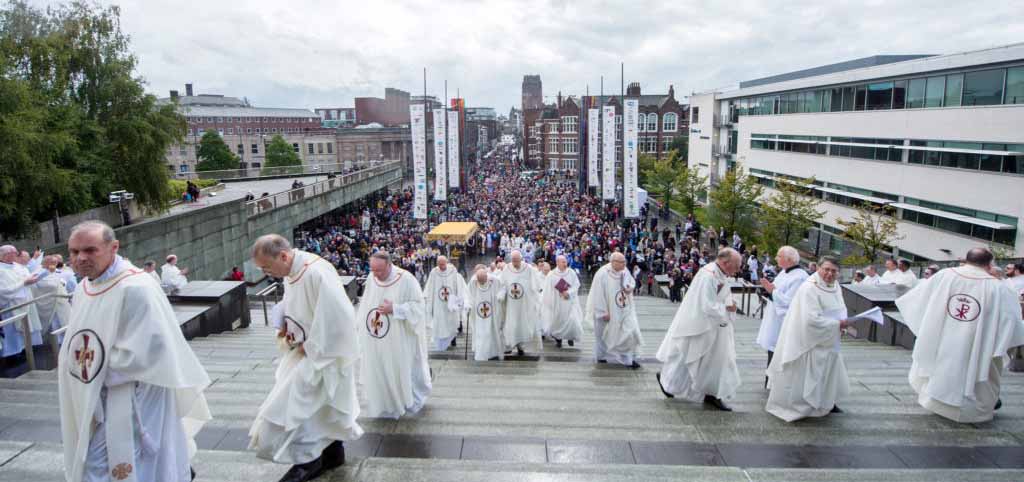 രാവിലെ 9. 30ന് അര്പ്പിച്ച ദിവ്യബലിയില് ലിവര്പ്പൂള് ആര്ച്ച് ബിഷപ്പ് മാല്ക്കം മക്മഹന് മുഖ്യകാര്മികനായിരുന്നു. തുടര്ന്ന് 11ന് ഇംഗ്ലണ്ടിലെയും വെയില്സിലെയും ബിഷപ്പ് കൗണ്സില് അധ്യക്ഷനും വെസ്റ്റ്മിനിസ്റ്റര് ആര്ച്ച് ബിഷപ്പുമായ വിന്സെന്റ് നിക്കോള്സിന്റെ മുഖ്യ കാര്മ്മികത്വത്തില് ദിവ്യബലി അര്പ്പണം നടന്നു. ആര്ച്ച് ബിഷപ്പ് മക്മഹന് വചനസന്ദേശം നല്കി. 1 മണിക്ക് ആണ് യുകെയുടെ പൊതുവീഥിയിലൂടെ ദിവ്യകാരുണ്യ ഈശോയെ എഴുന്നള്ളിച്ചുകൊണ്ട് പ്രദിക്ഷണം നടന്നത്. ക്രിസ്തുരാജന് ഓശാന പാടി നീങ്ങിയ പതിനായിരങ്ങള് മഴയെ അവഗണിച്ചാണ് ദിവ്യകാരുണ്യ പ്രദിക്ഷണത്തില് ഭാഗഭാക്കായത്.