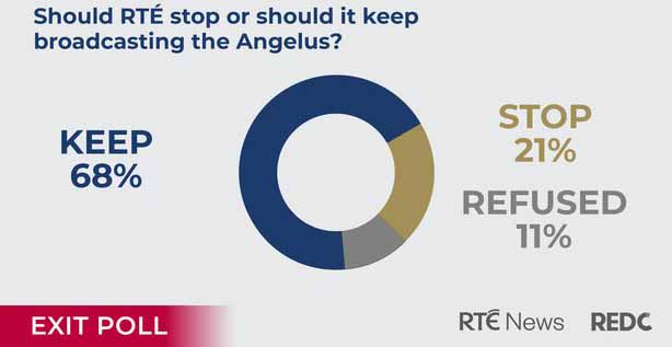 ഡബ്ലിന്: റേഡിയോ ടെലിഫിസ് ഐറന് അഥവാ ആർടിഇ ദേശീയ മാധ്യമത്തിൽ ദിനംപ്രതി സംപ്രേക്ഷണം ചെയ്യുന്ന പ്രാർത്ഥന അവസാനിപ്പിക്കരുതെന്ന് അയർലണ്ടിലെ ജനങ്ങൾക്കിടയിൽ നടത്തിയ എക്സിറ്റ് പോൾ ഫലം. എക്സിറ്റ് പോളിൽ പങ്കെടുത്ത മൂന്നിൽ രണ്ട് ആളുകളും ആഞ്ചലസ് അഥവാ 'കര്ത്താവിന്റെ മാലാഖ' എന്ന കത്തോലിക്ക സഭയുടെ പരമ്പരാഗത പ്രാർത്ഥനാ ക്രമം നിലനിർത്തണം എന്നു ആവശ്യപ്പെട്ടു. എക്സിറ്റ് പോളിൽ പങ്കെടുത്ത അറുപത്തിയെട്ടു ശതമാനം ആളുകളും ആഞ്ചലസ് പ്രാർത്ഥനാ ക്രമം തുടരണം എന്നു അഭിപ്രായപ്പെട്ടു. വെറും ഇരുപത്തിയൊന്നു ശതമാനം ആളുകൾ മാത്രമാണ് ആഞ്ചലസ് പ്രാർത്ഥന ദേശീയ മാധ്യമത്തിൽ സംപ്രേക്ഷണം ചെയ്യരുതെന്ന് അഭിപ്രായപ്പെട്ടത്.