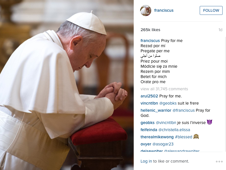 ചിത്രങ്ങൾ ഷെയർ ചെയ്യുന്ന സോഷ്യൽ മീഡിയ പ്ലാറ്റ്ഫോമായ ഇൻസ്റ്റാഗ്രാമിൽ 'ഫ്രാൻസിക്കസ് (franciscus)' എന്ന പേരിൽ ഫ്രാൻസിസ് മാർപാപ്പ തുറന്ന അക്കൗണ്ടിൽ 1.6 മില്ല്യൻ ഫോളോവേർസ്. ഇൻസ്റ്റാഗ്രാമിൽ ആദ്യം പോസ്റ്റ് ചെയ്തത് അദ്ദേഹം പ്രാർത്ഥിച്ചു കൊണ്ടിരിക്കുന്ന ഒരു ചിത്രമാണ്. തുടർന്ന് "എനിക്കു വേണ്ടി പ്രാർത്ഥിക്കുക" എന്ന സന്ദേശവും കാണാം.